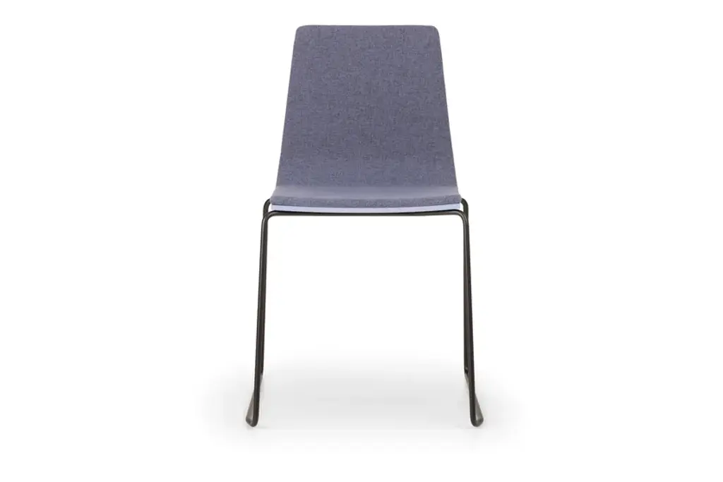 Marina is a sled chair with beech wood multilayers single shell, thickness 10 mm. Veneer in beechwood, natural oakwood, wengè stained oakwood. Upholstery in fabric or leather (see color chart).The design of Marina is characterized by linear and dynamic geometries.The shape of the seat in multilayered wood interacts with the metal frame, generating a system of marked personality. Particularly recommended for the contract branch, it is available also in the padded version and can be customized with armrests and other accessories.