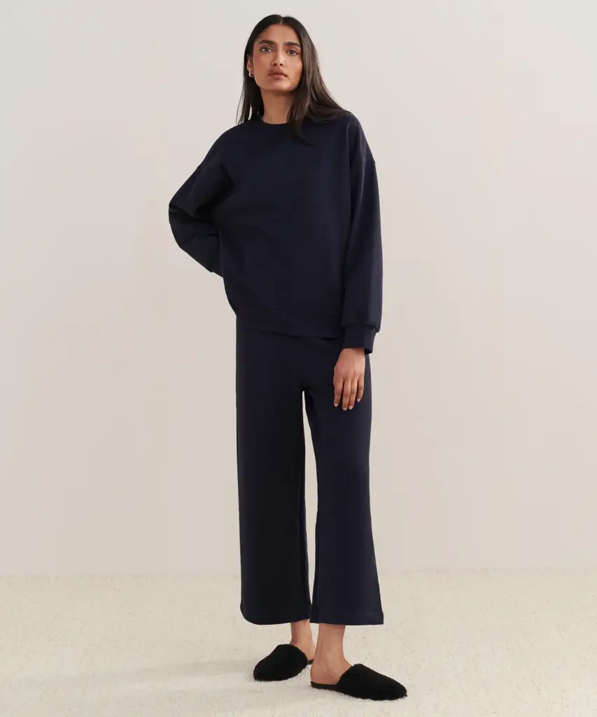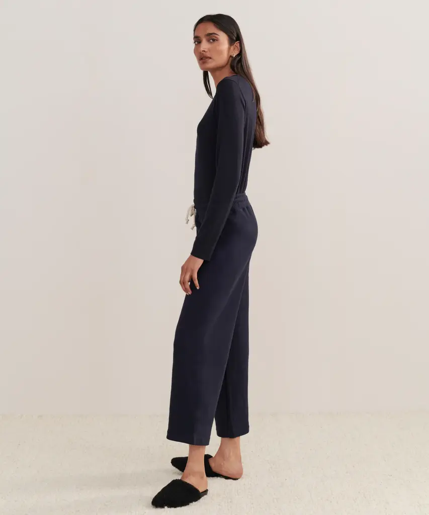 Marina Sweatpant Navy Elevate every moment at home or on the go with our answer to the perfect everyday sweats. With a more structured feel, this loungewear essential offers up a clean and modern take on classic comfort. 100% cotton. Made in the USA. Wide-leg sweatpant with drawstring waist.
