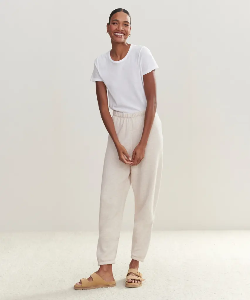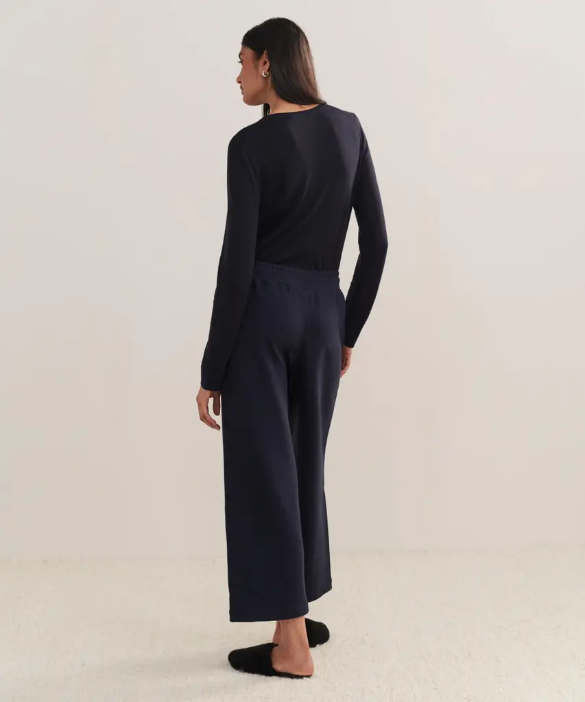 Marina Sweatpant Navy Elevate every moment at home or on the go with our answer to the perfect everyday sweats. With a more structured feel, this loungewear essential offers up a clean and modern take on classic comfort. 100% cotton. Made in the USA. Wide-leg sweatpant with drawstring waist.