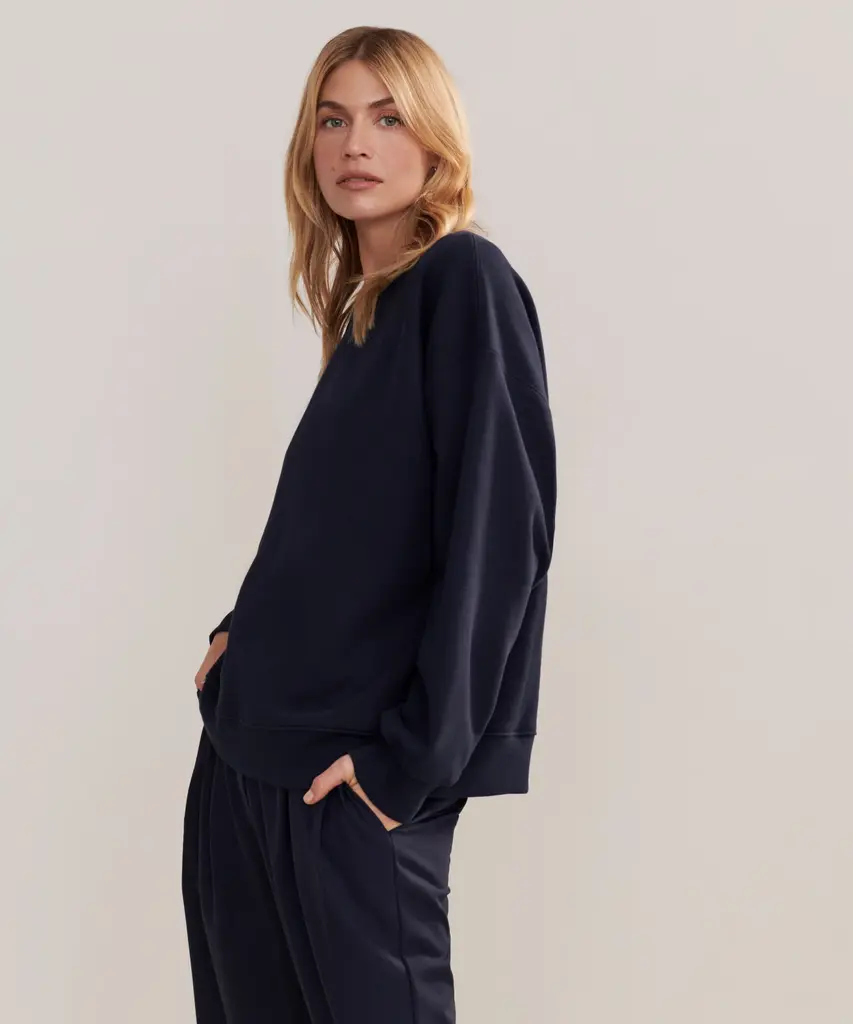 Marina Sweatshirt Navy Elevate every moment at home or on the go with our answer to the perfect everyday sweatshirt. With a more structured feel, this loungewear essential offers up a clean and modern take to classic comfort.  100% cotton. Made in the USA. Boxy sweatshirt with drop shoulder.