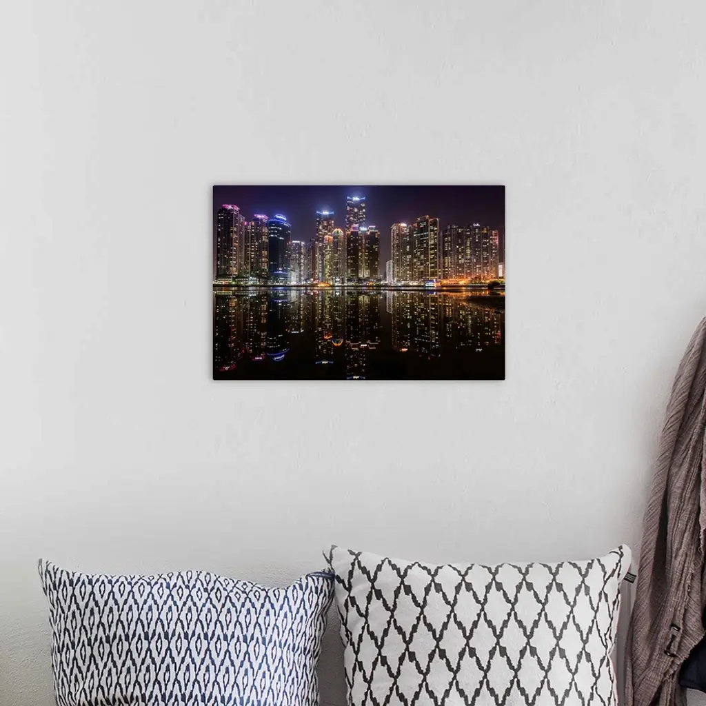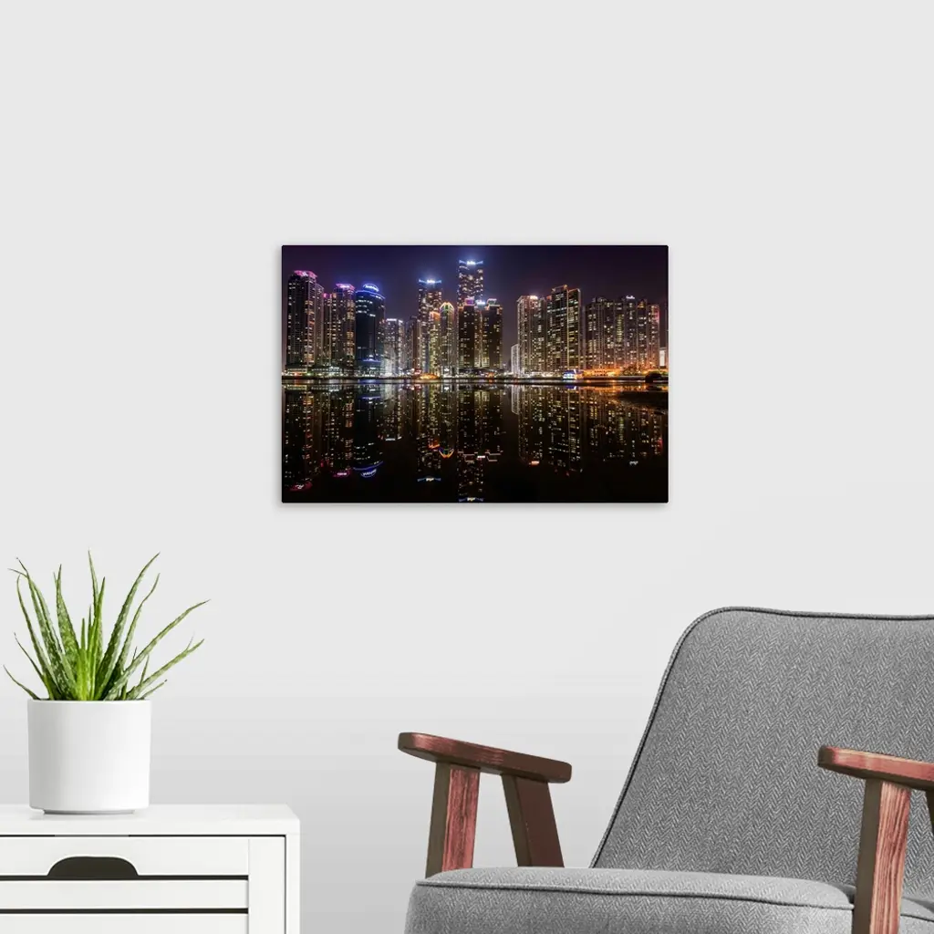 The city of Busan, South Korea, lit up at night, reflected in the water.