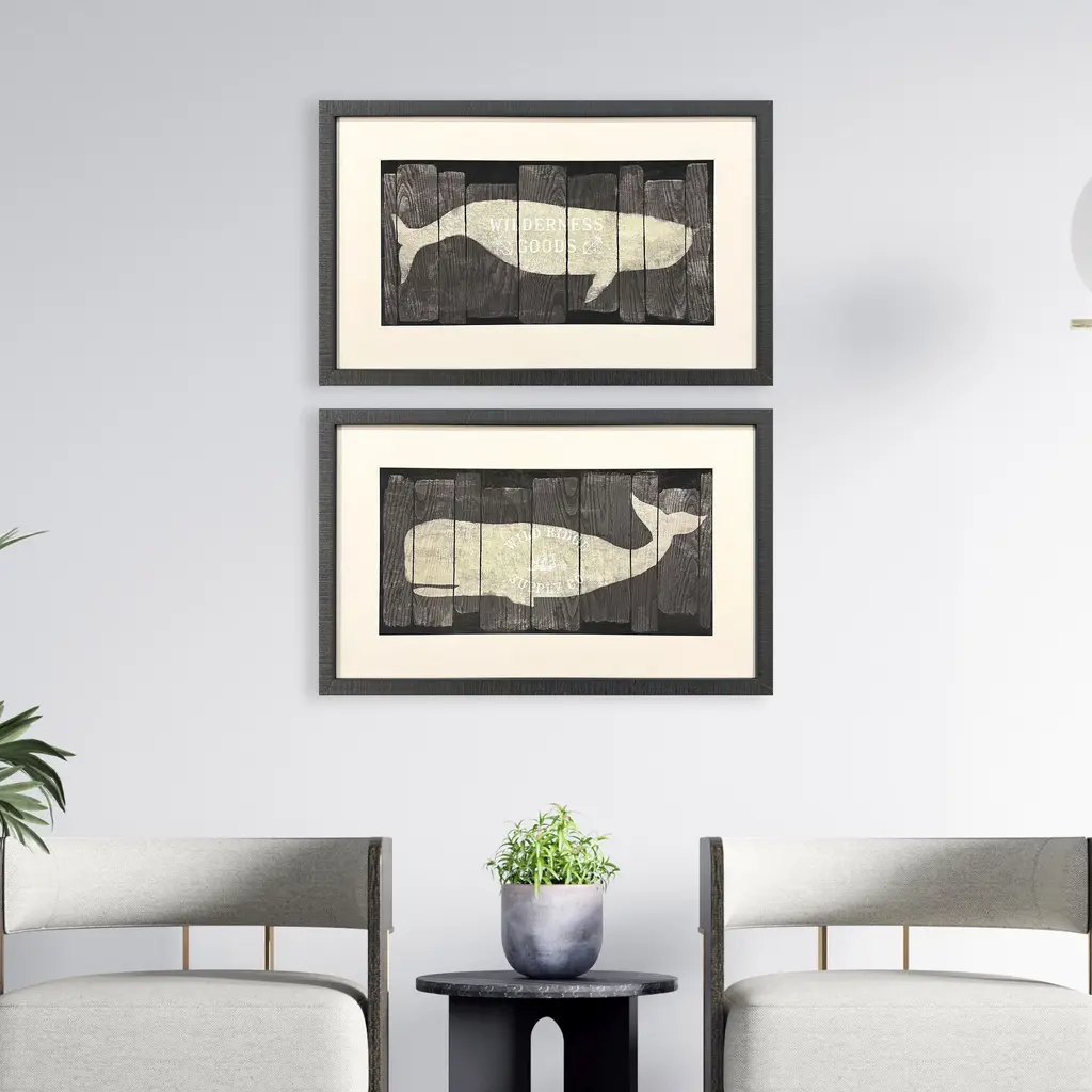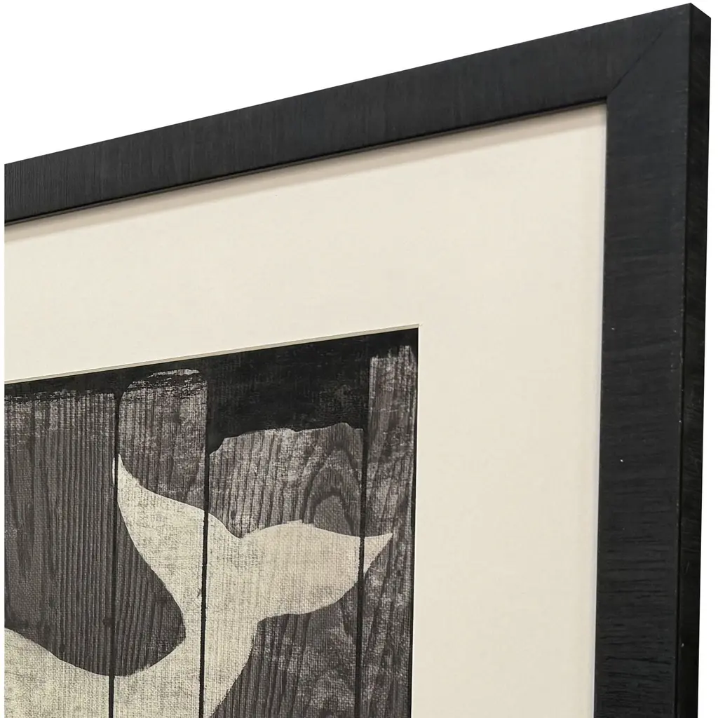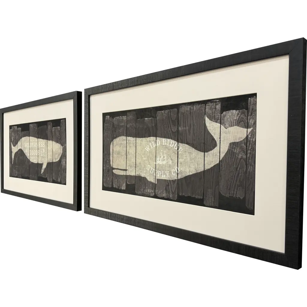 Rustic whale wood sign prints have a nostalgic nautical feel. Matted in putty and framed in a flat profile molding with a dark espresso wood finish.