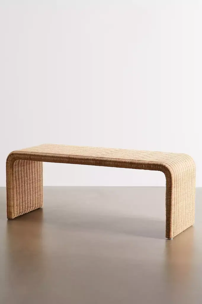 Arching coffee table made from woven strands of rattan in two size options for ultra-versatile use. Flat tabletop with rounded corners in a natural finish. Grab one or pick up both sizes to nest them together for endless ways to display! Available exclusively at Urban Outfitters.