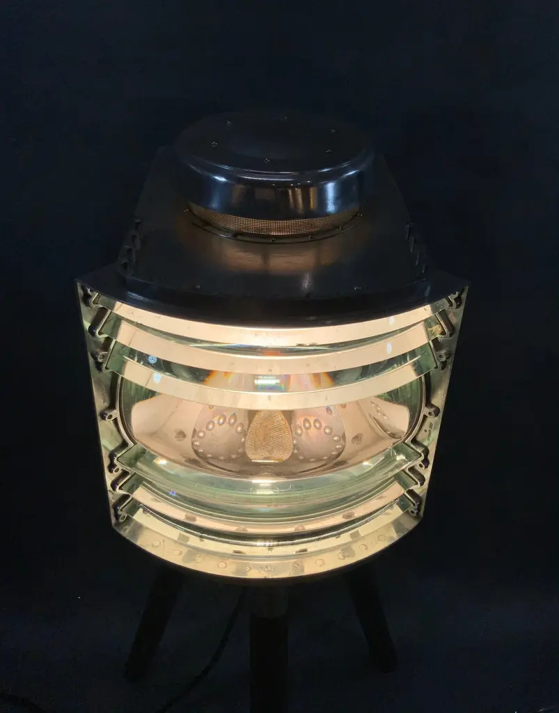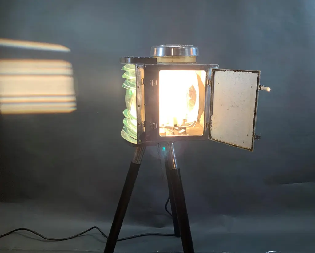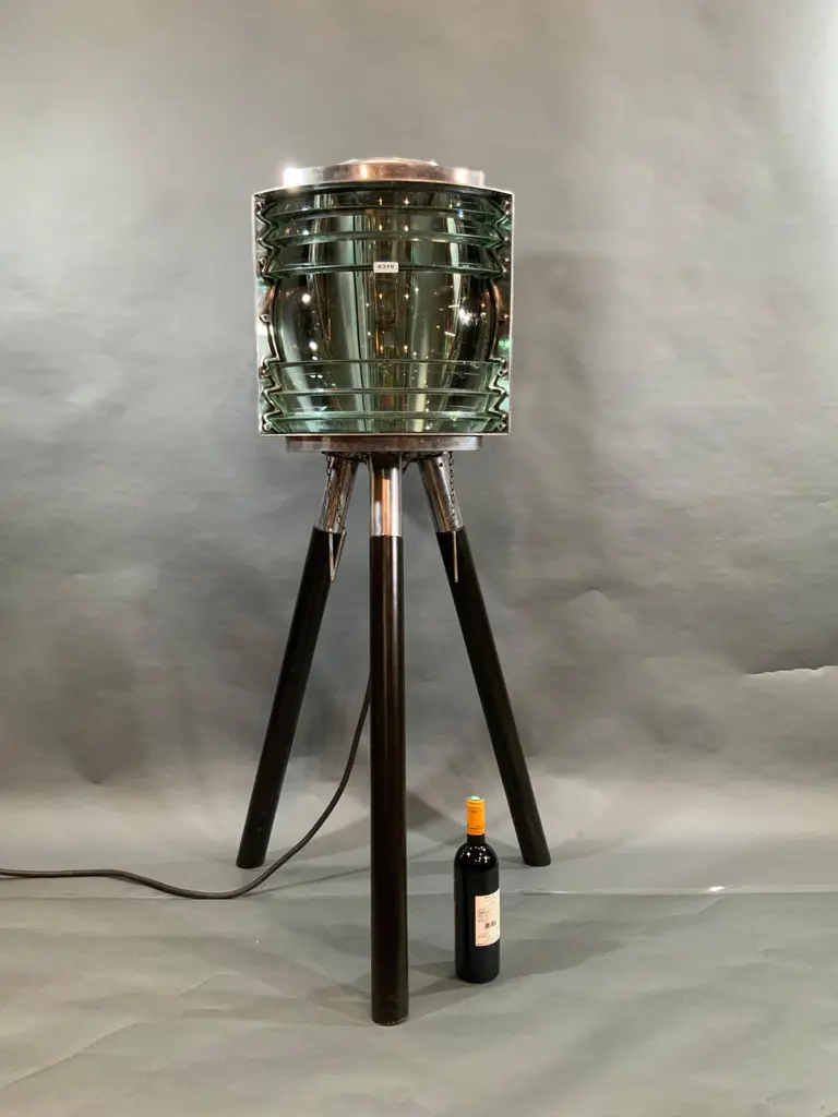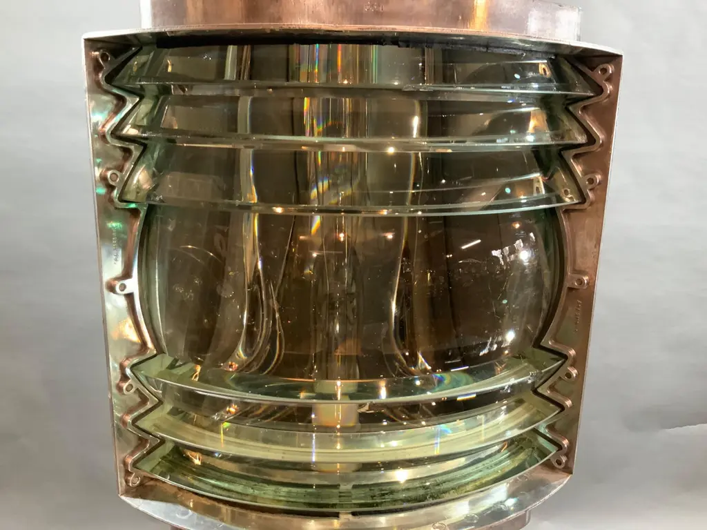 From the U.S. Navy, this awesome prismatic beacon has the most incredible lens you will ever see. Polished aluminum pole mounted high power nautical range light. Fitted with huge cut glass Fresnel lenses. The steel case has been meticulously polished and lacquered. The interior has been rewired with modern sockets and two bulbs. This is substantial in size and is quite a fine display. This is an eighty year-old relic with modern-day appeal.Overall dimensions: 55" H x 18" L x 19" D. 65 pounds.