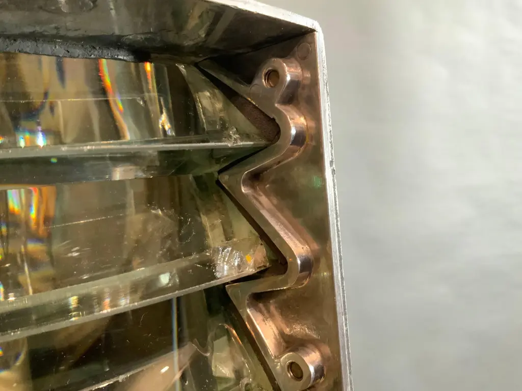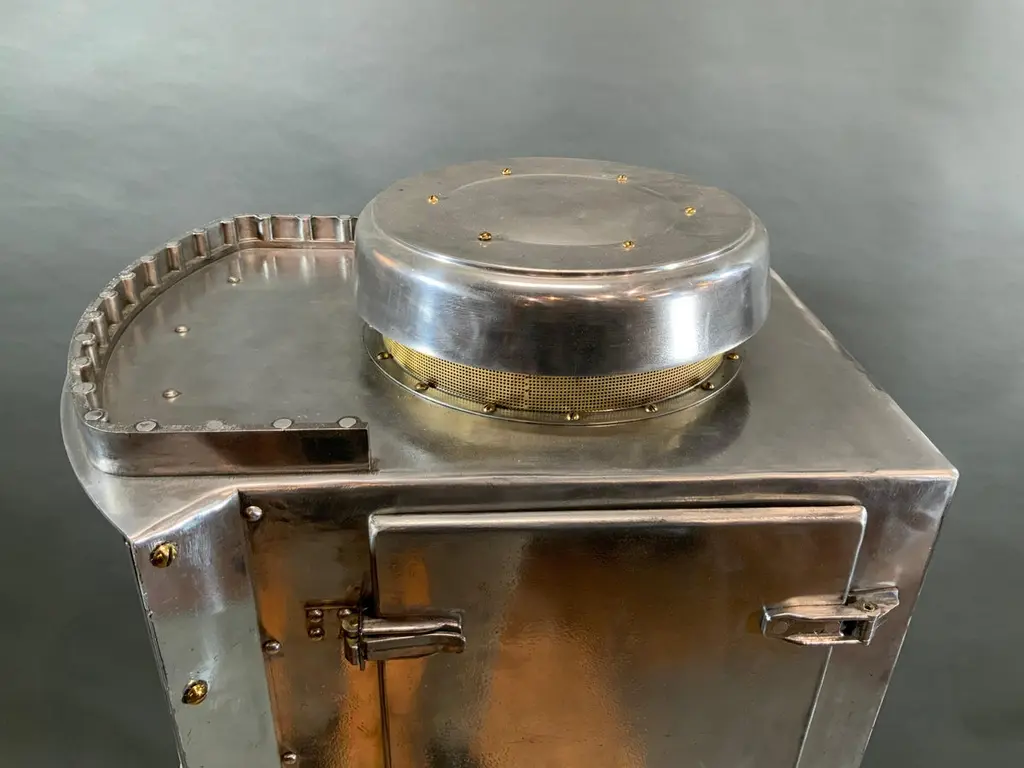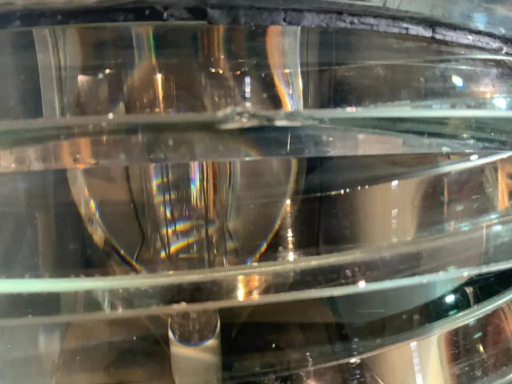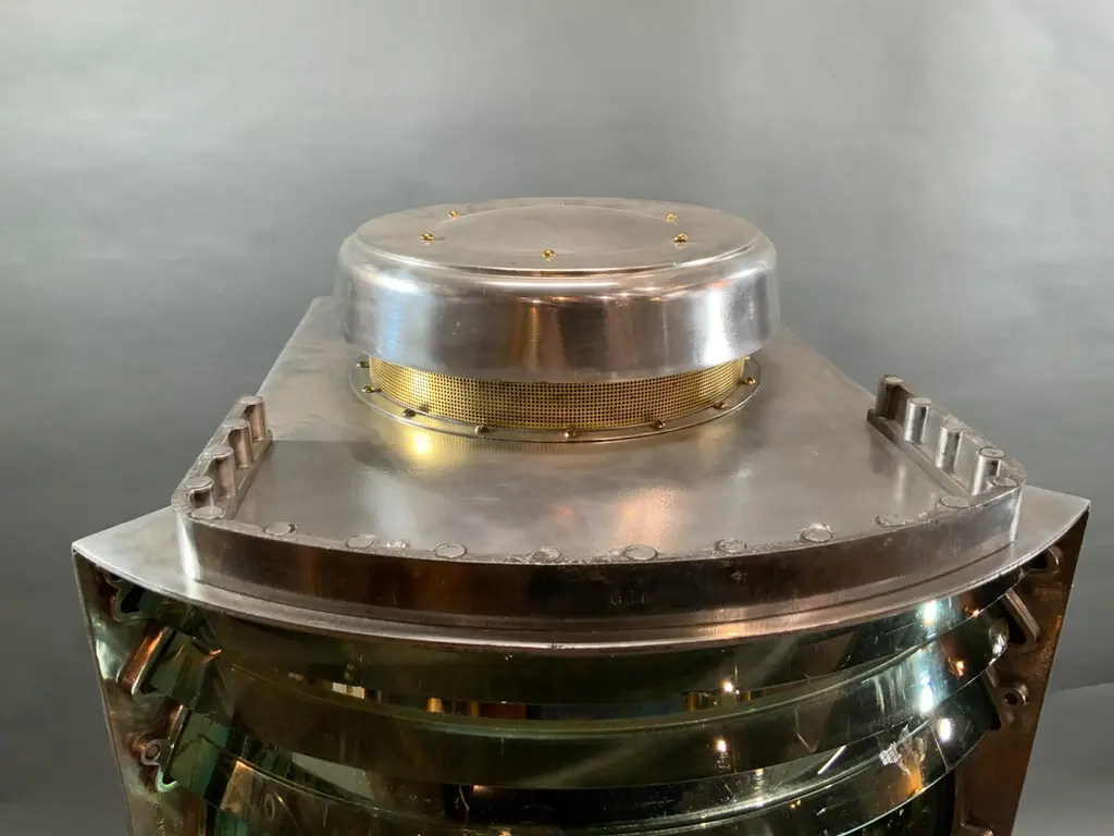 From the U.S. Navy, this awesome prismatic beacon has the most incredible lens you will ever see. Polished aluminum pole mounted high power nautical range light. Fitted with huge cut glass Fresnel lenses. The steel case has been meticulously polished and lacquered. The interior has been rewired with modern sockets and two bulbs. This is substantial in size and is quite a fine display. This is an eighty year-old relic with modern-day appeal.Overall dimensions: 55" H x 18" L x 19" D. 65 pounds.