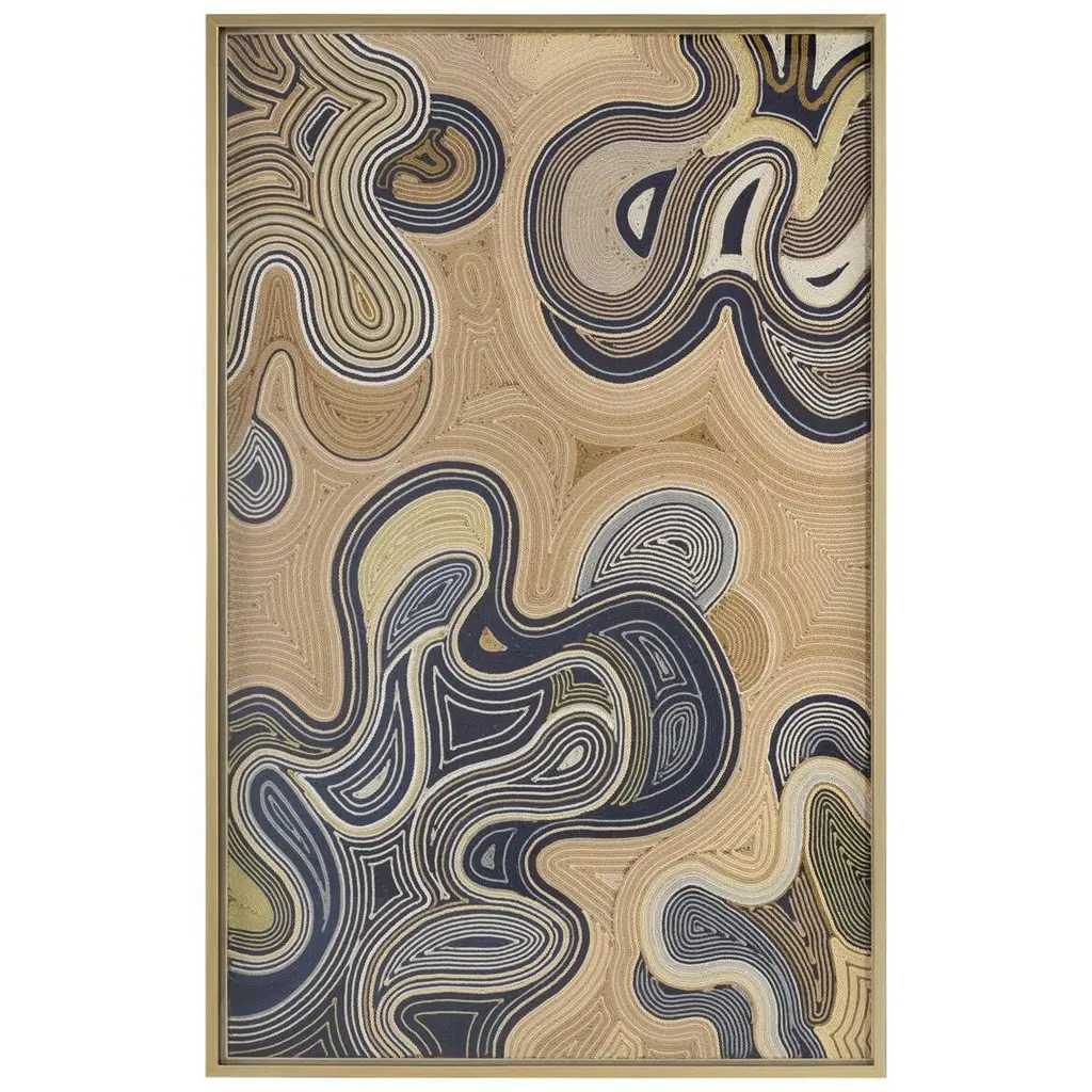 58"W X 84"H X 2.5"D A visual fluidity of textile cording creates a flow or current of riches in variations of blue and gold. This piece by Mark McDowell is framed under glass in a soft gold-leaf molding.
