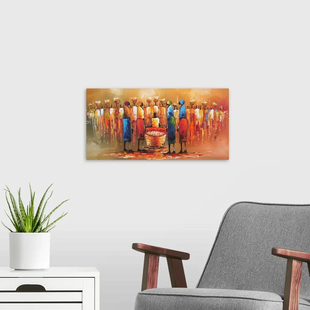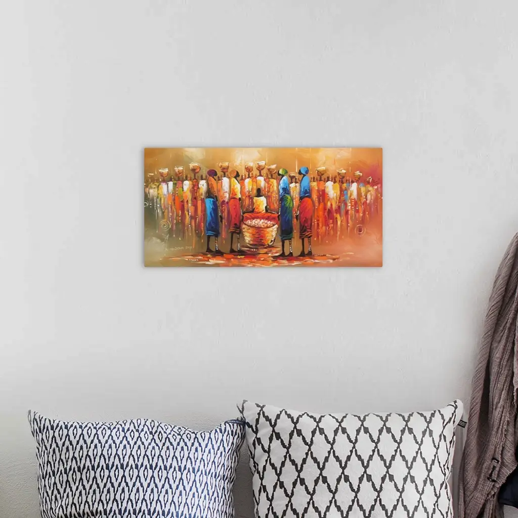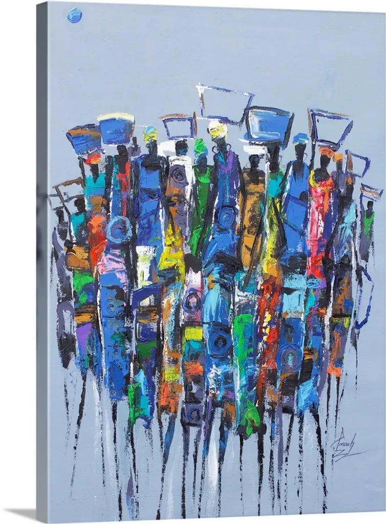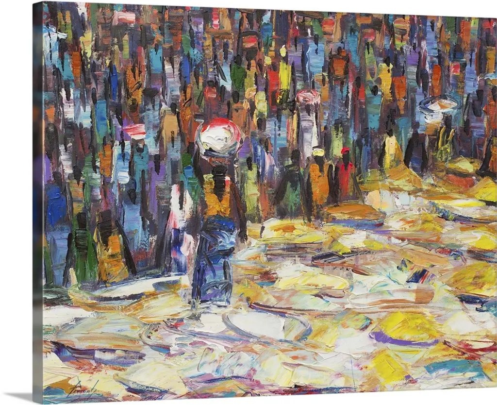 Three women, one with a baby strapped to her back, huddle close to a fourth one sitting next to a basket full of goods to sell. Looking at the busy crowd on the market center, they patiently await their turn. Bernard Mensah seems to accompany them as he captures the busy energy of a Ghanaian market with a bright palette of acrylic paints.