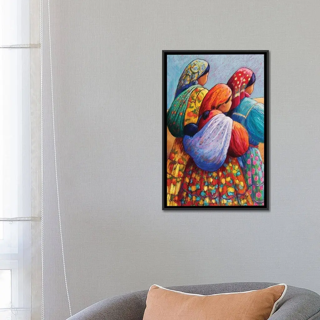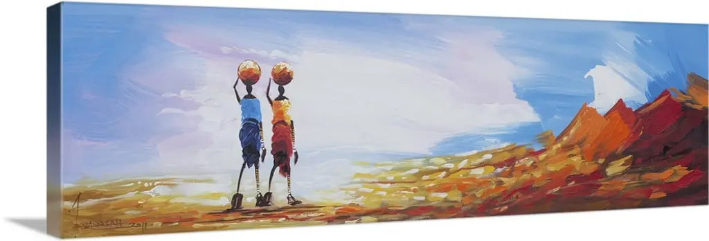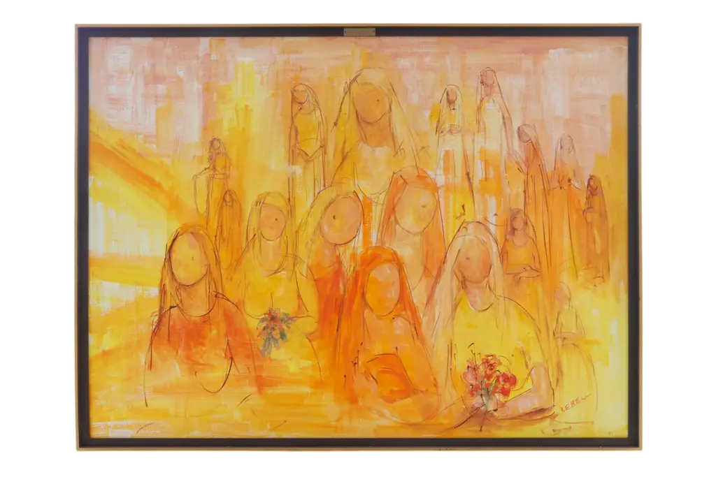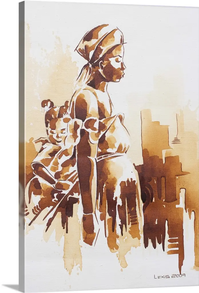 Three women, one with a baby strapped to her back, huddle close to a fourth one sitting next to a basket full of goods to sell. Looking at the busy crowd on the market center, they patiently await their turn. Bernard Mensah seems to accompany them as he captures the busy energy of a Ghanaian market with a bright palette of acrylic paints.