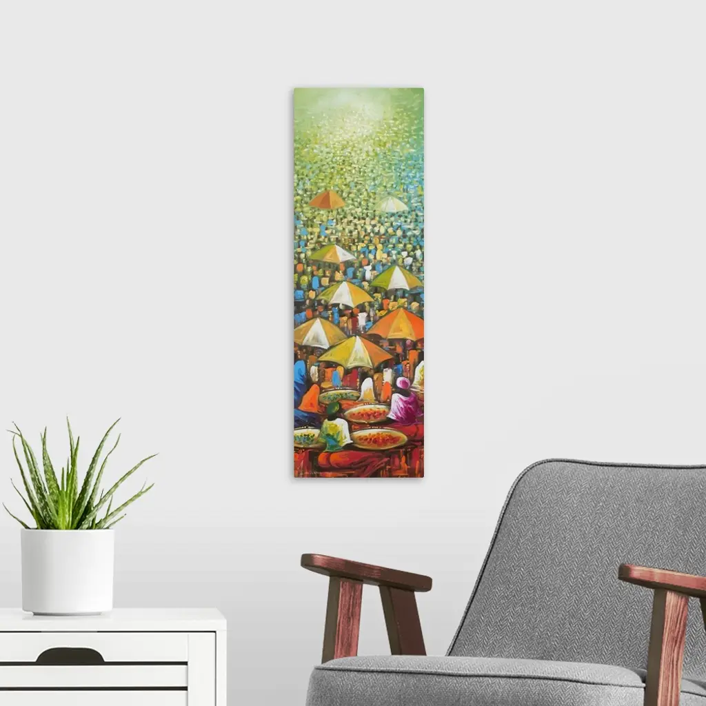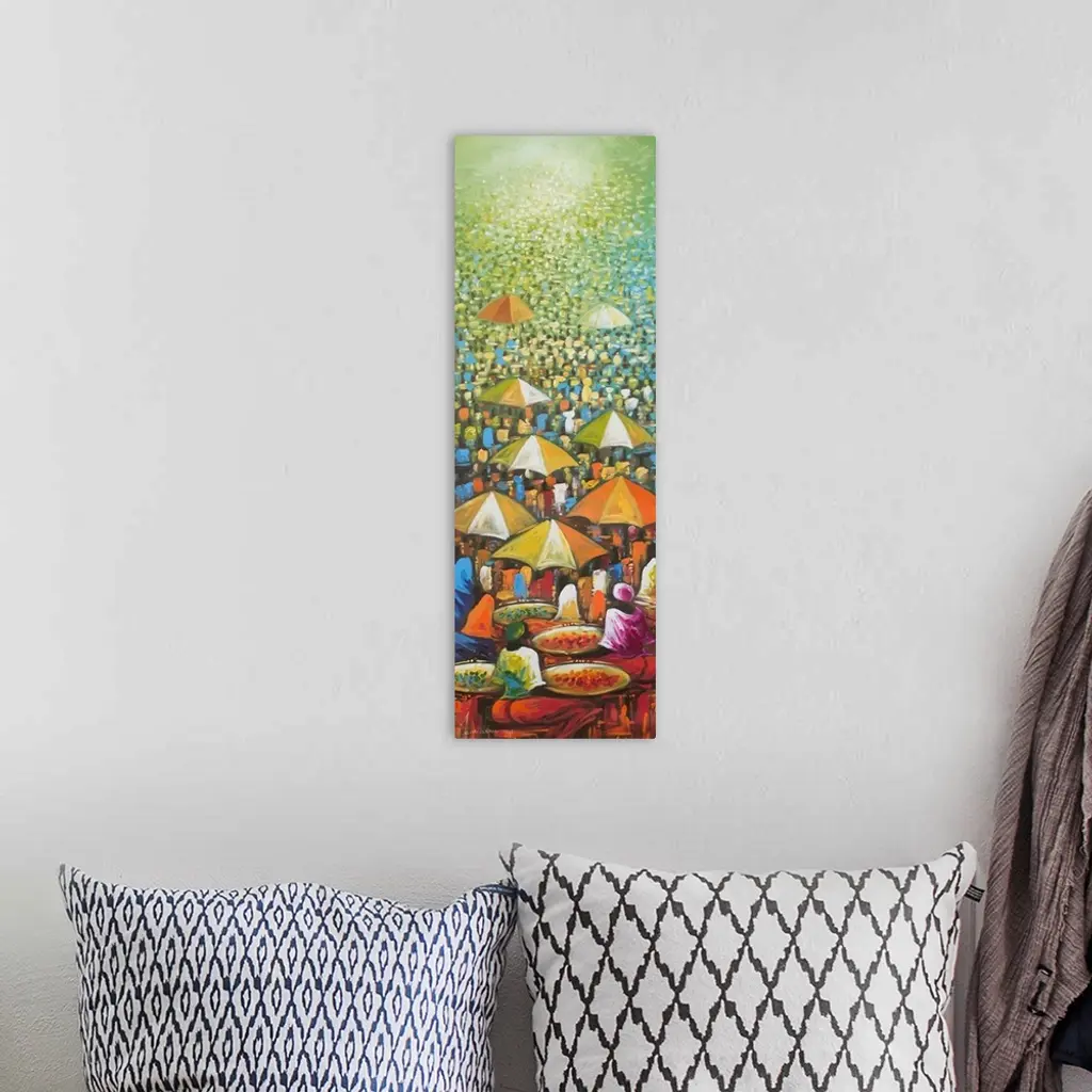 Wednesday's market appears like a mirage where myriad people blend into one colorful palette. At the front, women display vegetables on trays hoping to lure the busy customers. Some are shielded from the sun's bright rays as they sit under big umbrellas. Bernard Mensah seems to be standing at a good location, masterfully transferring unto the canvas the busy scene before him.