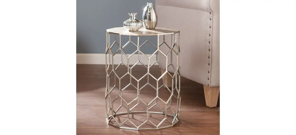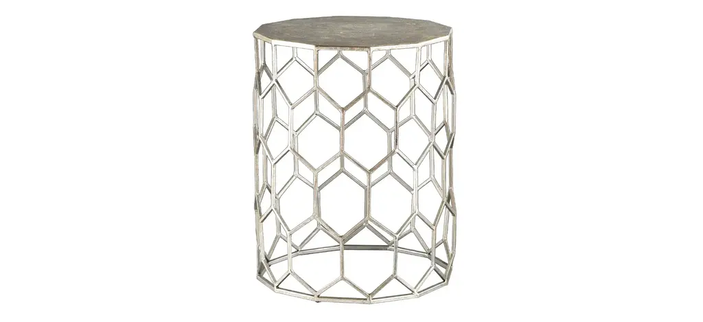 Marlee Metal Accent Table is cool with this galvanized silver accent table. Polygon tabletop crowns honeycomb, hexagonal frame in an all metal side table that appears as though forged from one sheet of ancient iron. Peek-a-boo storage hides beneath while stacks of crossword puzzle books and your cup of coffee relax up top. Plot a course through the Bronze Age with this eclectic accent table next to the sofa, your favorite reading chair, or a bench in the entryway. Variations in antiqued finish and wire frame will occur, giving each table a one-of-a-kind feel.