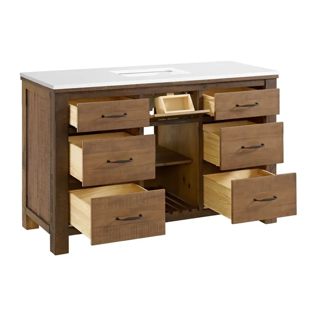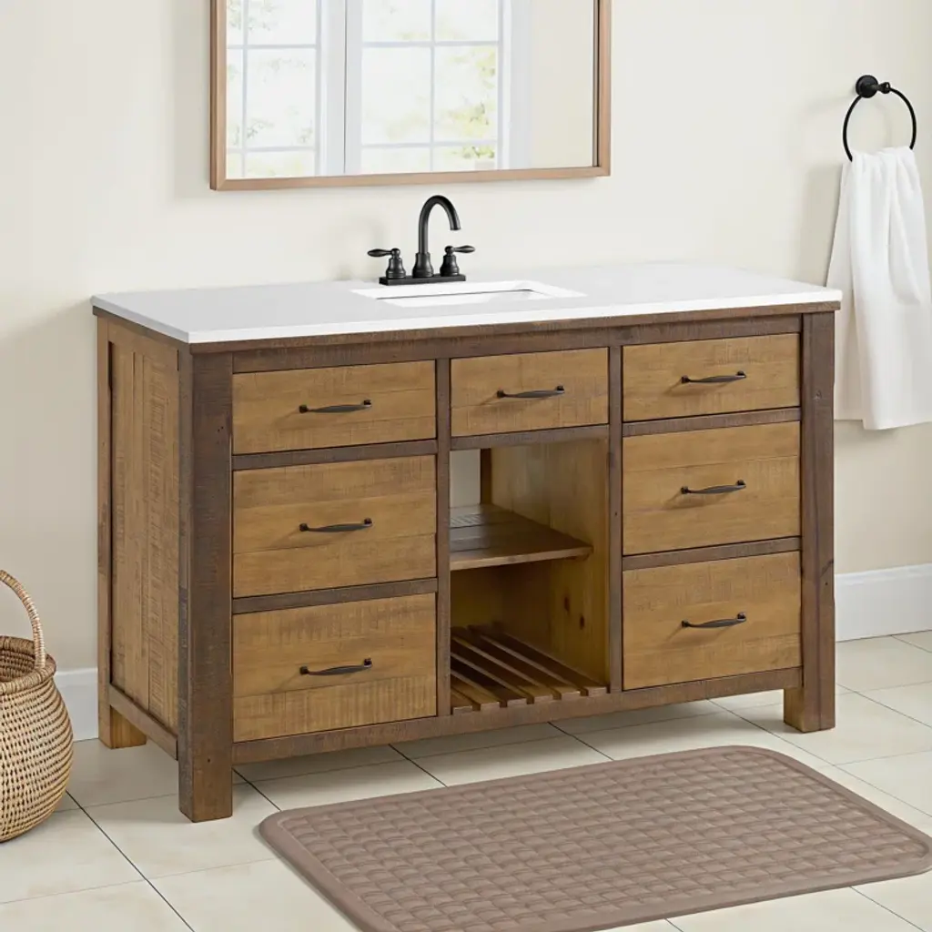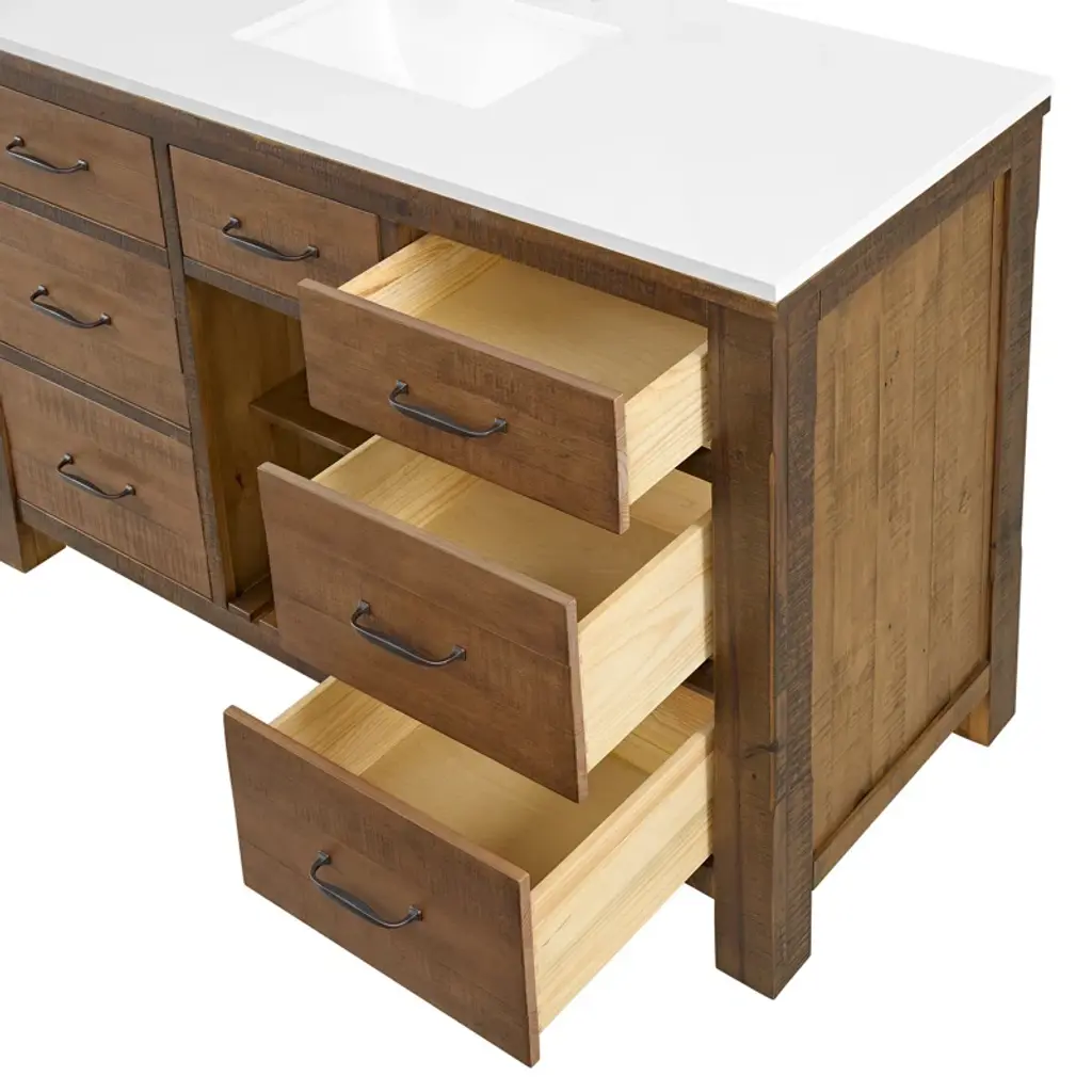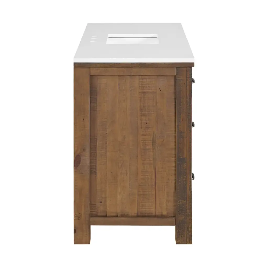 Bring farmhouse charm into your bathroom but with the benefit of modern conveniences. This sturdy vanity will last for years to come. It features pure white quartz with a matte finish top resting upon a solid pine, hand-finished frame. Ample storage is provided by soft-close, undermount drawers built with dovetail joinery.