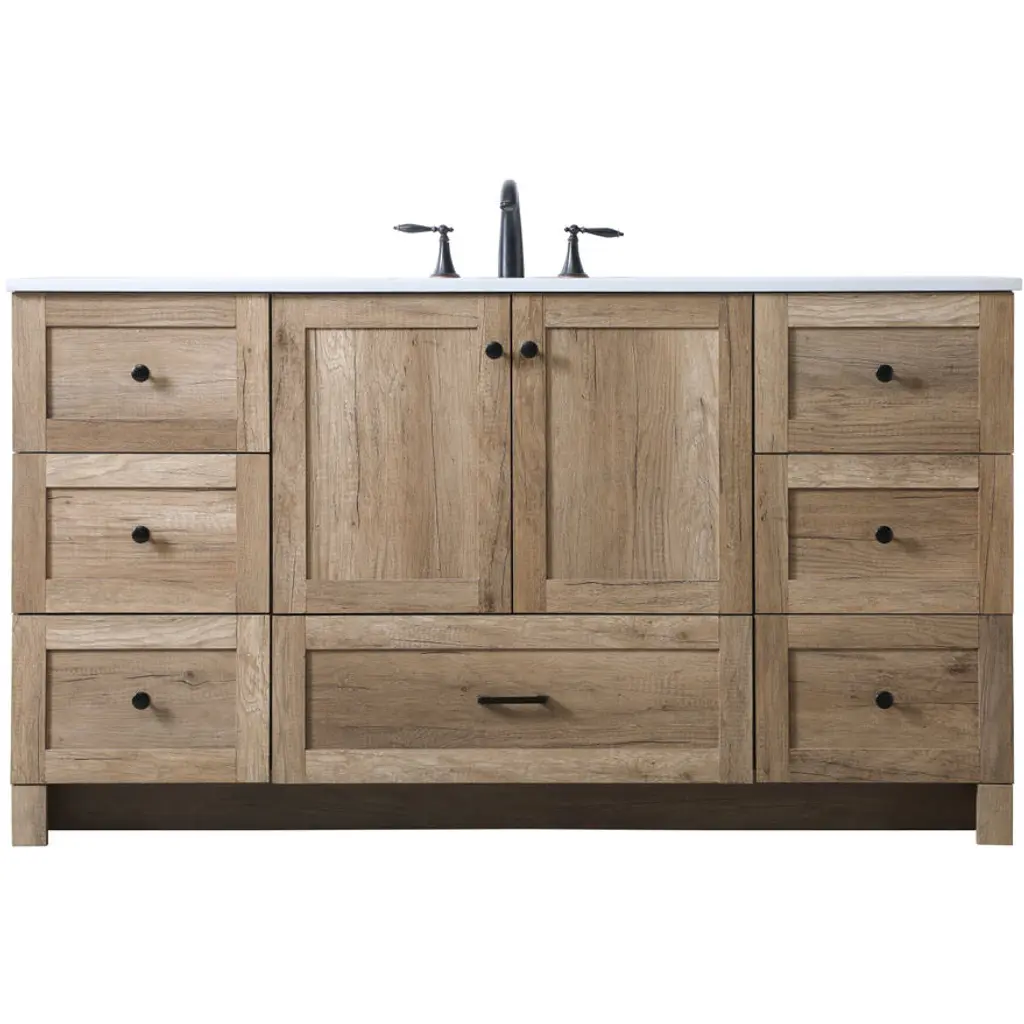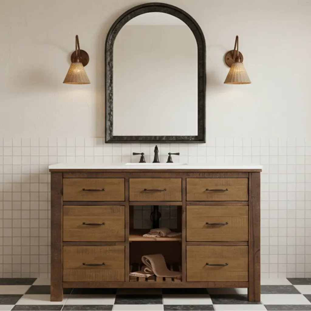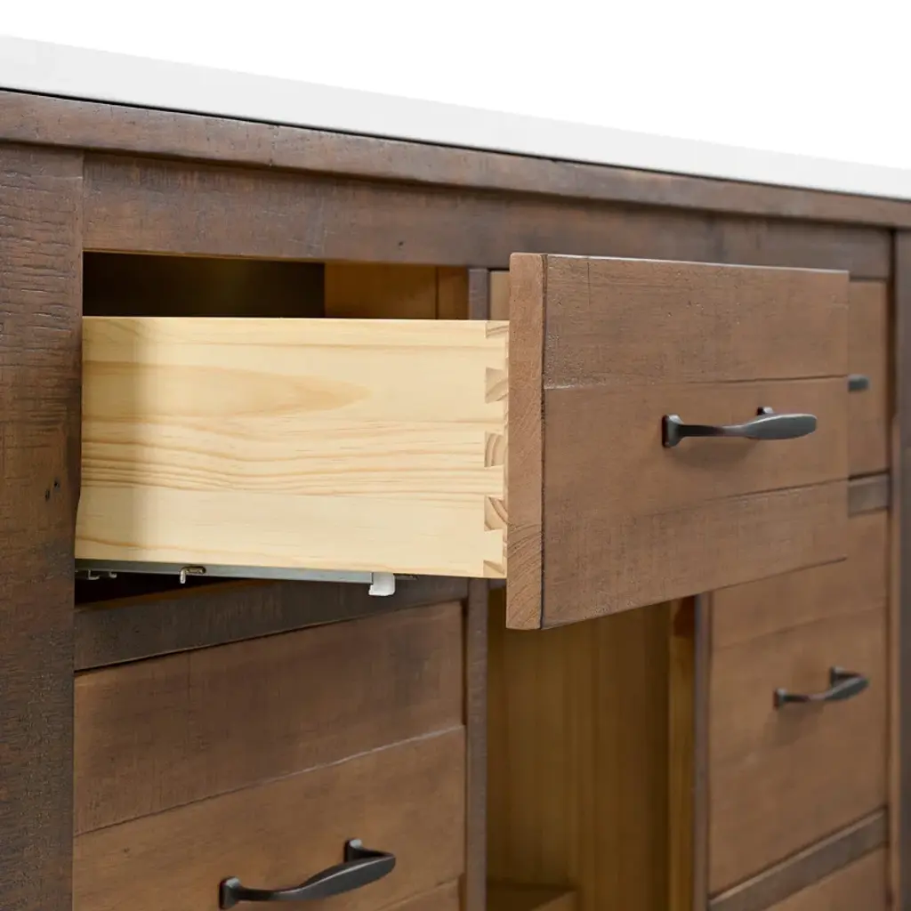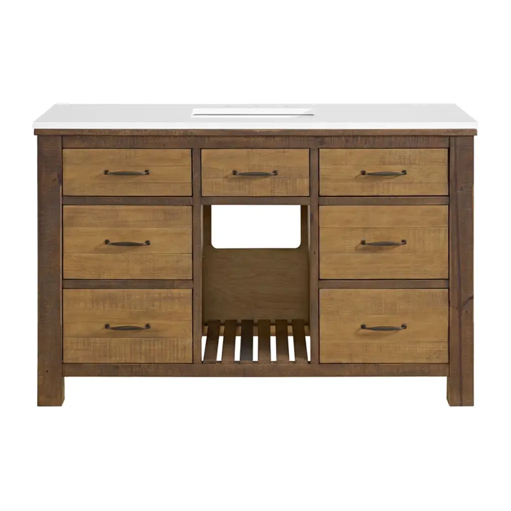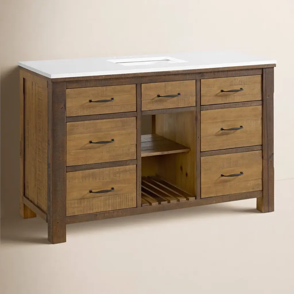 Bring farmhouse charm into your bathroom but with the benefit of modern conveniences. This sturdy vanity will last for years to come. It features pure white quartz with a matte finish top resting upon a solid pine, hand-finished frame. Ample storage is provided by soft-close, undermount drawers built with dovetail joinery.