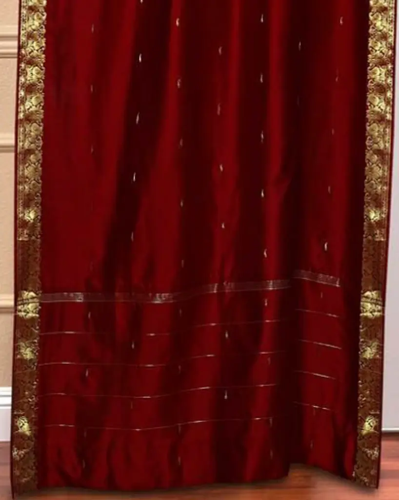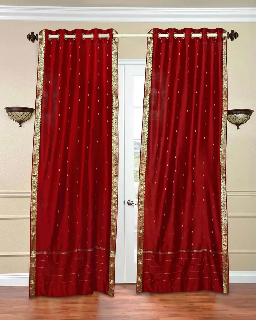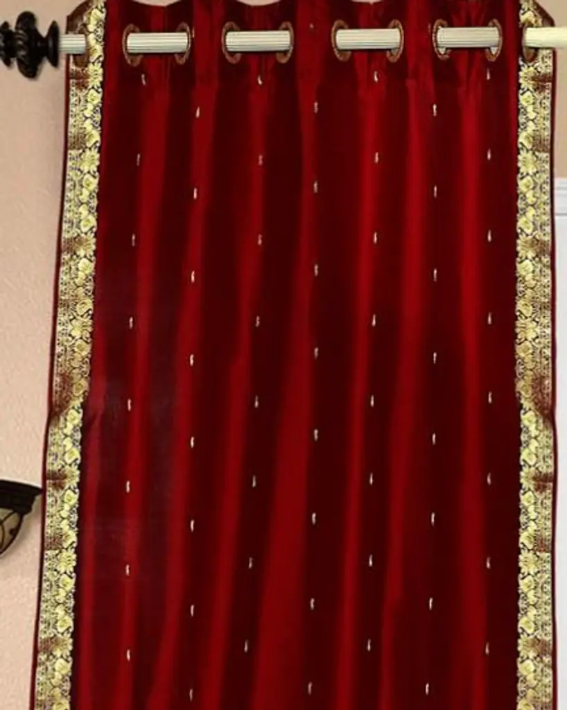 Ring-top drapery is sophisticated and contemporary. Ring-tops have decorative rings attached to the drapes. Rings create a pleated look that is crisp and modern. Sari Curtains / Drapes / Panels are the perfect choice for those looking for light, elegant drapes with a touch of luxury. It has smooth finish with a soft sheen and feels gentle and cool to the touch. Sheer curtains made of saris allow light in through windows but prevent people looking in when they are drawn. Story Behind the Art: The fabric of these curtains are weaved on a hand-loom in a small rural village in India and then hand-dyed. The artisans are a group of young hand-crafters who have moved from small villages to a big town in Central India and make various home decor items out of these exotic sari fabrics. This gives these wonderful artisans a way to have sustainable income via selling to the worldwide market on the internet. Your purchase supports local and home-based work where the artisans can easily tend to their families and pass these time-honoMaroon skills from one generation to the next.