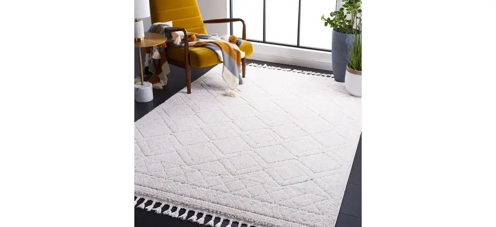 The Marrakesh Ivory Rug showcases the intriguing style derived from nomadic artistry. With a display of tribal motifs and smart fringed ends, these boho-chic Moroccan rugs are made of family-friendly synthetic yarns for comfort underfoot and lasting beauty.