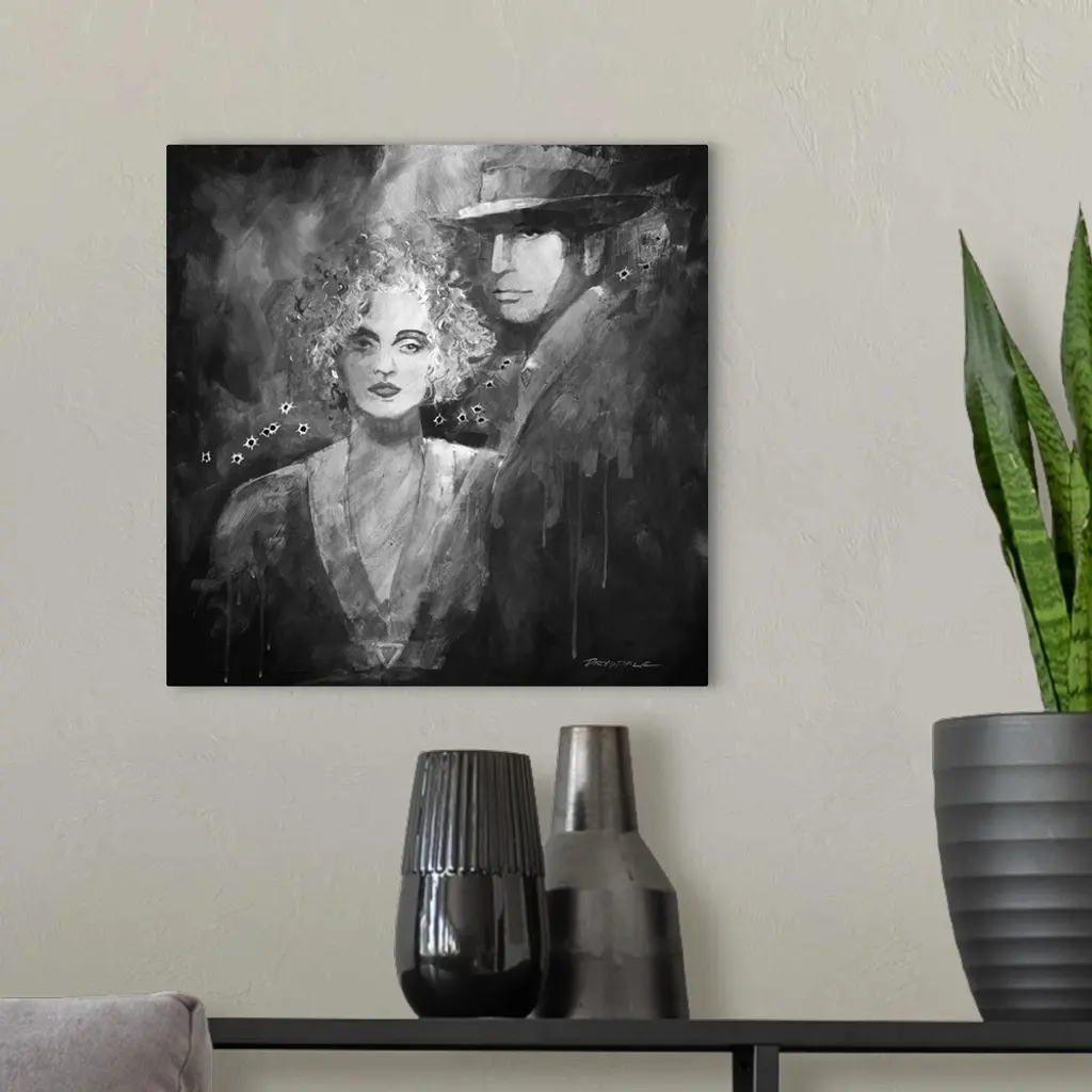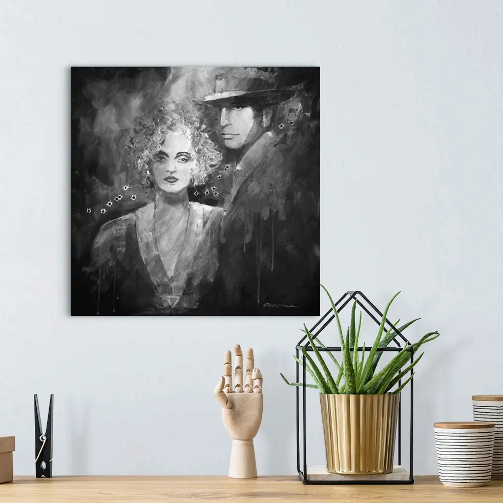 Black and white painted portrait of Bonnie and Clyde with bullet holes going through the middle.