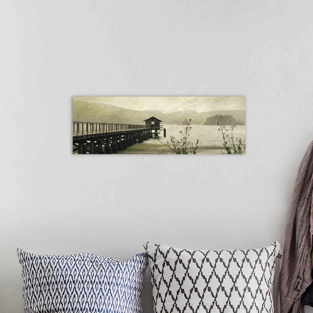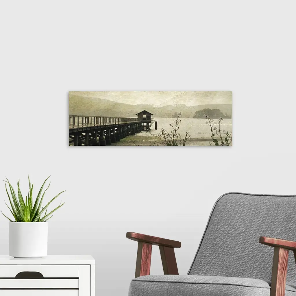 Wide angle, fine art photograph of a pier extending into the water, a small hut at the end. An overcast day, with swirling textures in the sky.