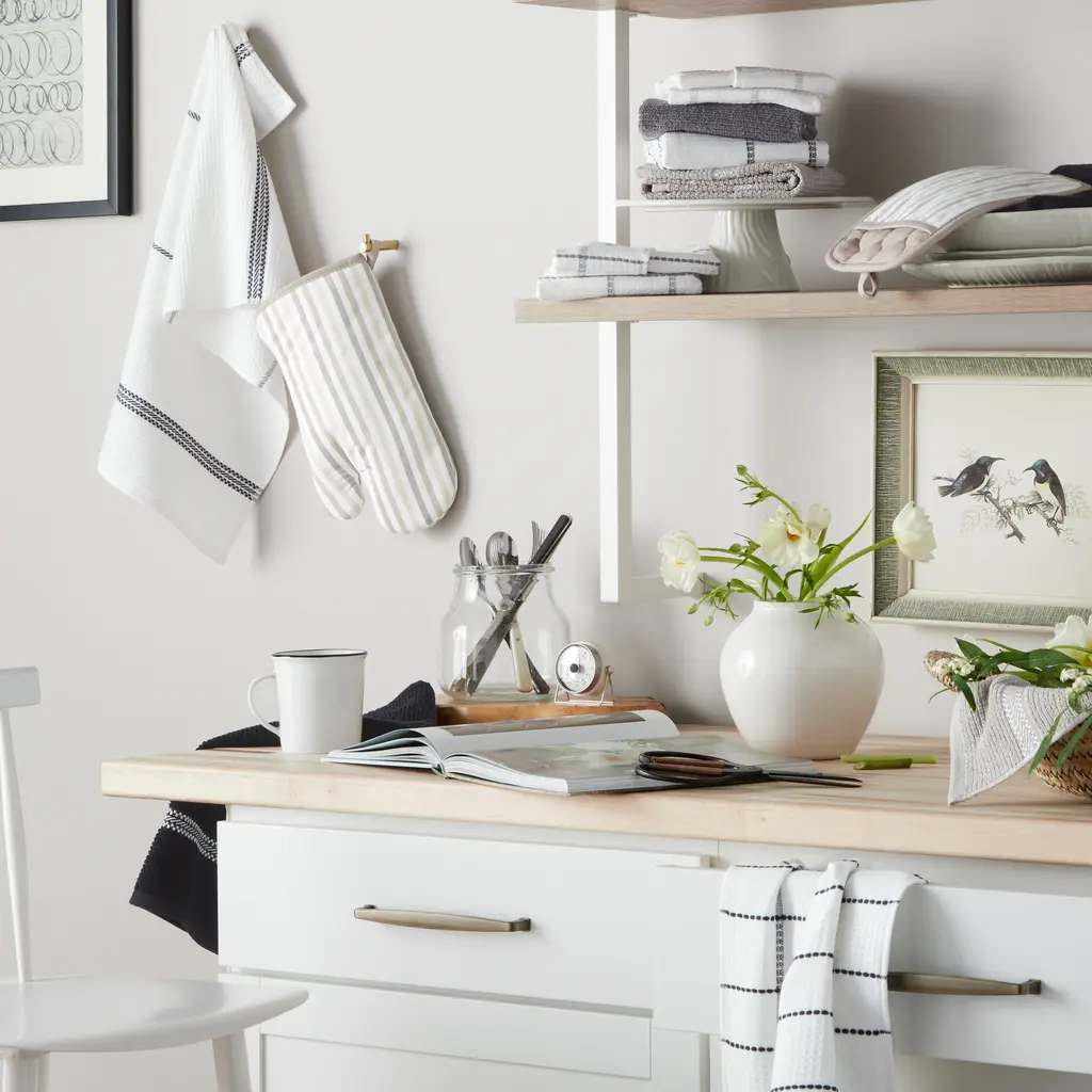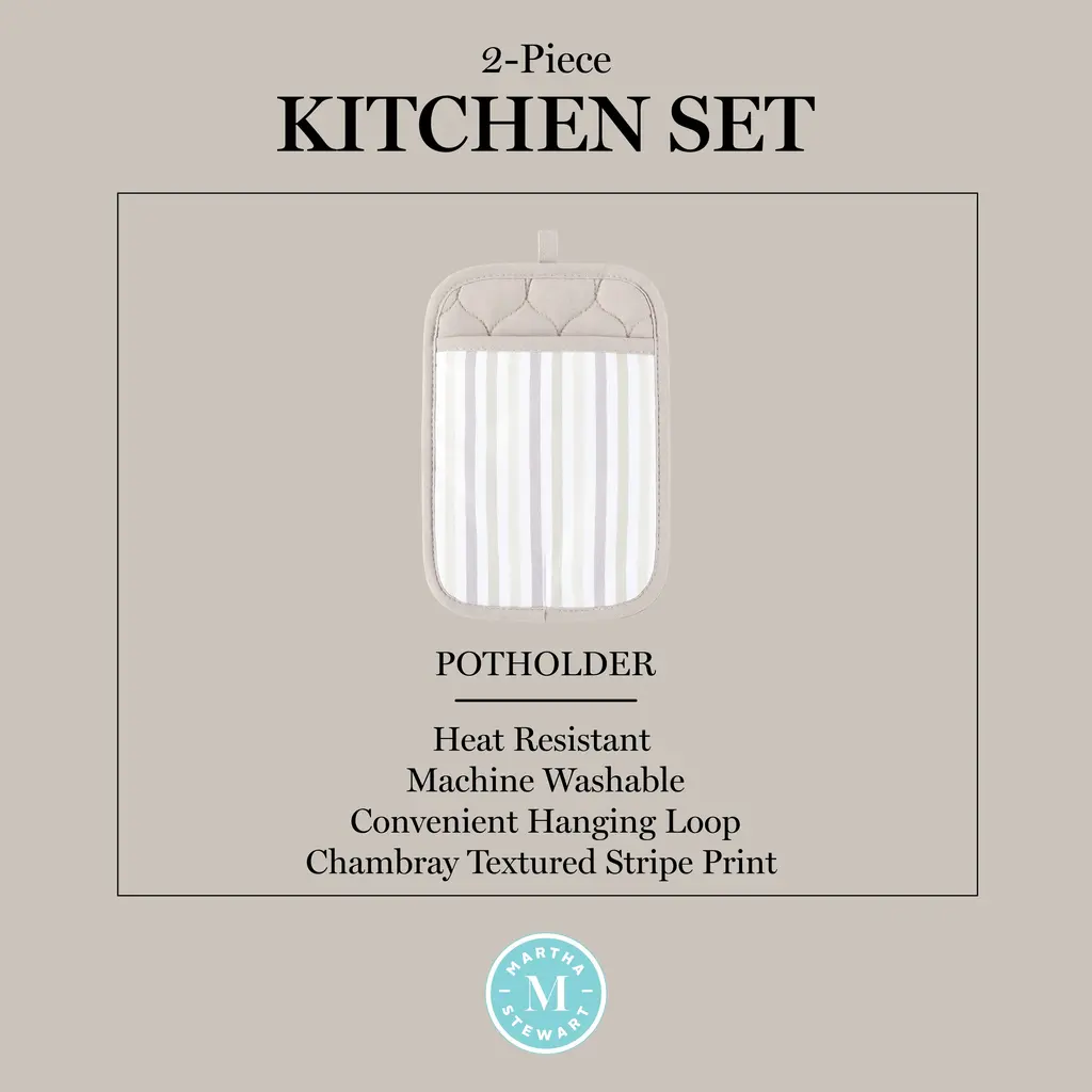Add style and function to your kitchen décor with the Martha Stewart Daisy Stripe Pot Holder 2-Pack Set. Made of 100% Cotton, these pot holders offer a beautiful combination of comfort and insulation. This chambray textured; printed set includes two potholders that each measure 7 inches wide by 10 inches long for easy use. They are heat resistant and will shield your hands from the heat while cooking and baking. Includes sturdy silicone grips and a convenient hanging loop for display or easy storage. Machine washable for easy cleaning.