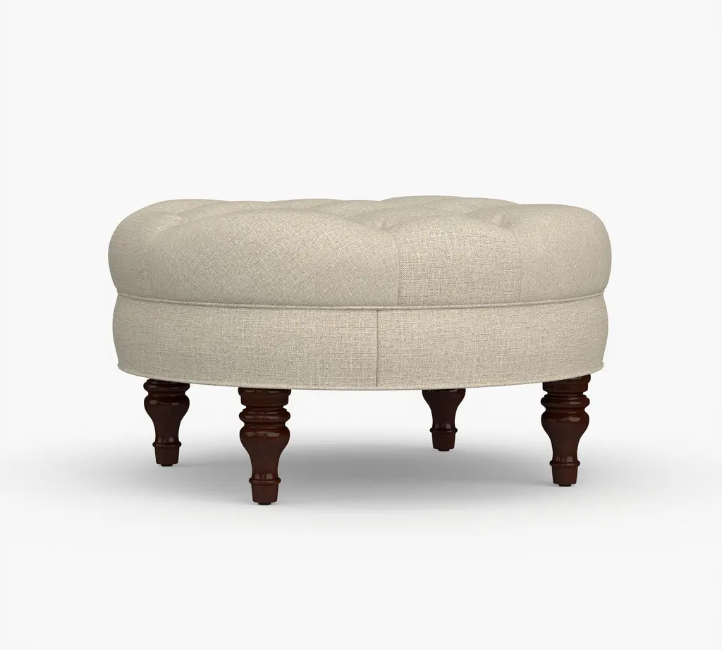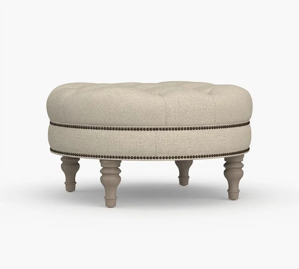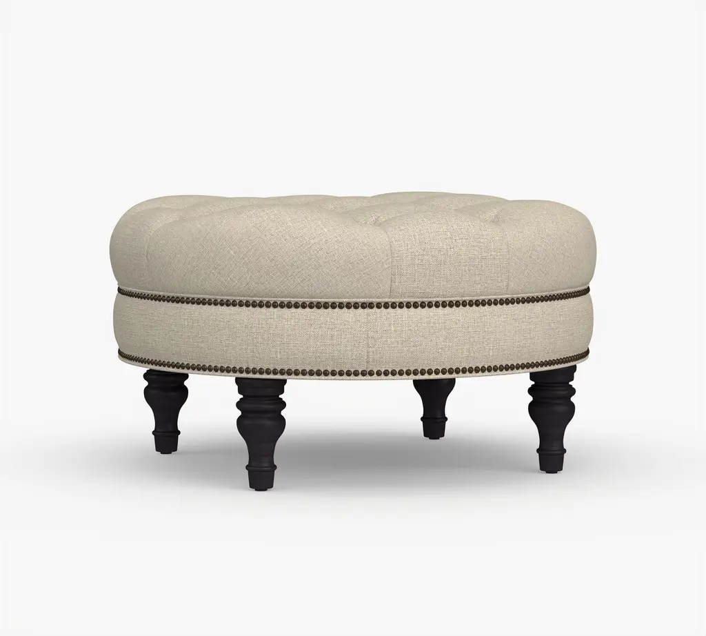 Richly covered in your choice of fabric, the Martin Upholstered Round Ottoman is fashioned after classic furniture of English gentleman’s clubs. Two rows of nailheads along the piped edges accentuate its handsome silhouette. It’s perfect as seating, footrest or oversized coffee table.