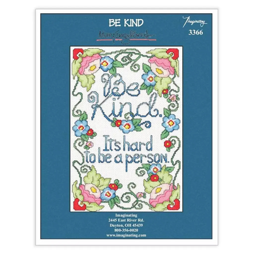 A charming reminder surrounded by beautiful flowers. Project includes full stitches, backstitching and French knots. Be Kind is designed to be stitched on 14ct white Aida fabric and uses 17 different colors of floss. Includes: instructions, floss, fabric, needle - Finished size 6.8" x 10.6" - Reads: Be Kind. It's hard to be a person. Model Specifications - Stitch count: 95w x 148h - Project size: 6.8" x 10.6" on 14cnt - Floss: 17 DMC floss colors - Fabric: 14ct white Aida