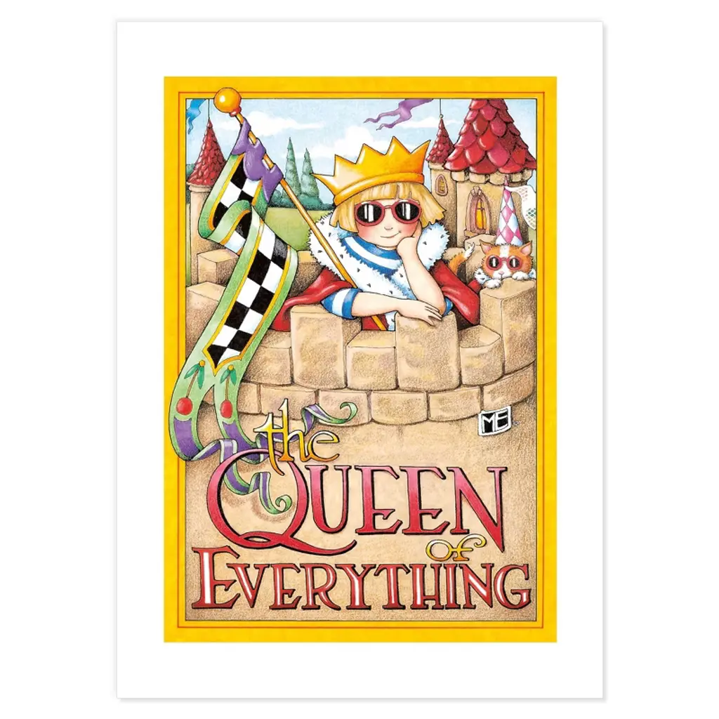 This pack of six postcards can be sent to friends and loved ones or simply hung on the wall to enjoy! If you love a particular piece, some of the art is available on other products—see the links below! Six 5 x 7 cards enclosed in a clear plastic sleeve (left to right, from top): - Queen Castle: "The queen of everything" - Princess of Quite a Lot: "The princess of quite•a•lot" - The Queen Bee: "The queen bee" - Queen Has Spoken: "The queen has spoken: Official list of demands..." - Good to Be Queen: "It's good to be queen" - Prince of Whatever's Left: "The prince of whatever's left." Check with the USPS for postage requirements.