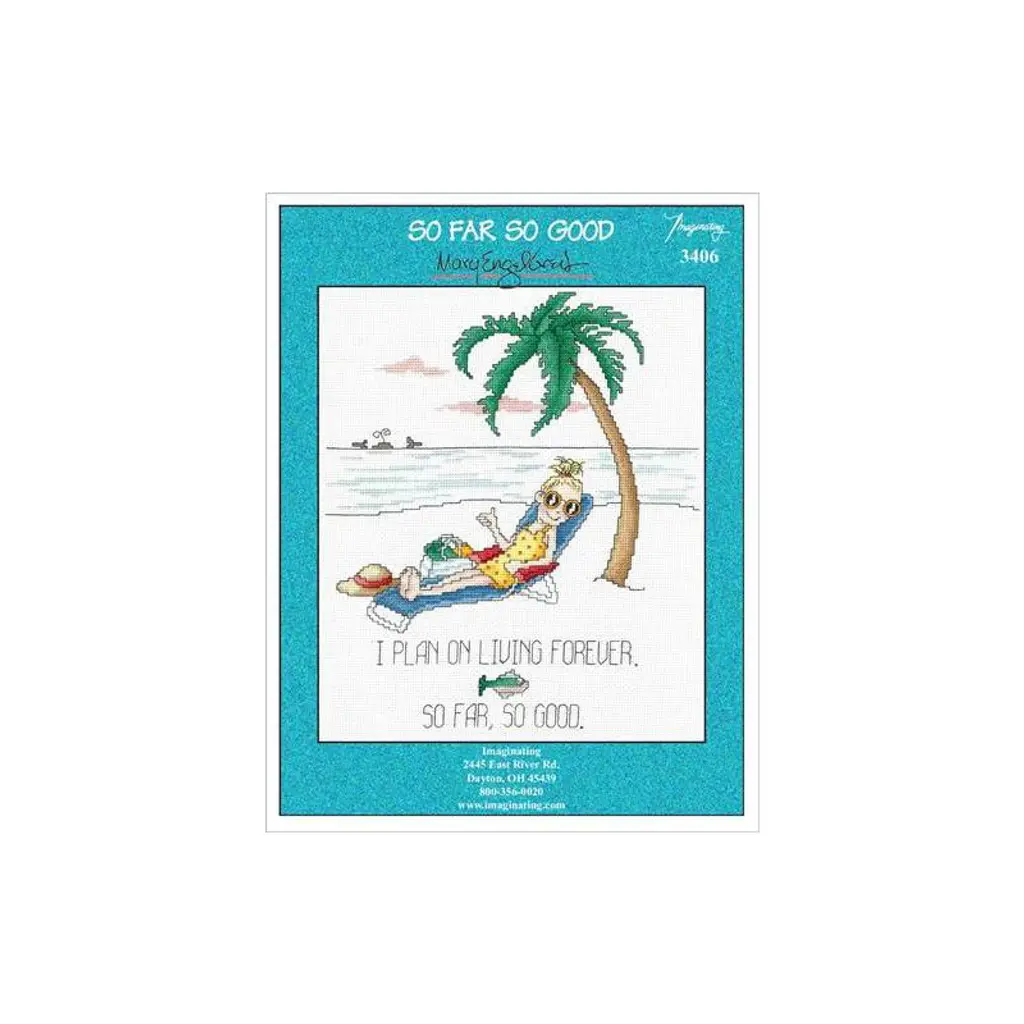 Take your R&R to a whole new level with these adorable and colorful design! Project includes full stitches, quarter stitches, French knots and backstitching. Chart will be in black and white symbols. So Far So Good is designed to be stitched on 14ct White Aida fabric and uses 28 different colors of floss. - Kit includes: instructions, floss, fabric, needle - Finished size: 9.3" x 10.9 Reads: I plan on living forever. So far, so good. Model Specifications: - Stitch Count: 130w x 152h - Project Size: 9.3" x 10.9" on 14cnt - Floss: 28 DMC floss colors - Fabric: 14ct White AidaDescription}