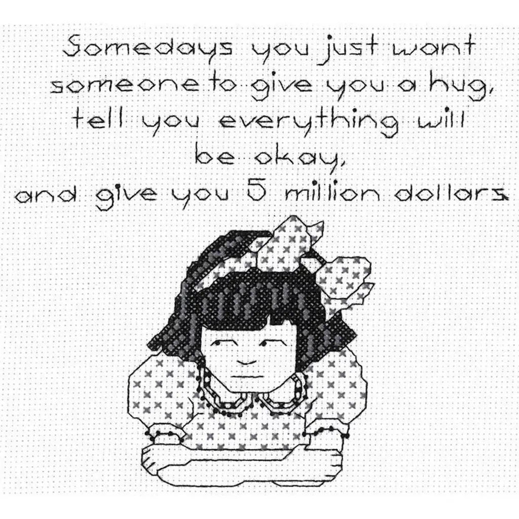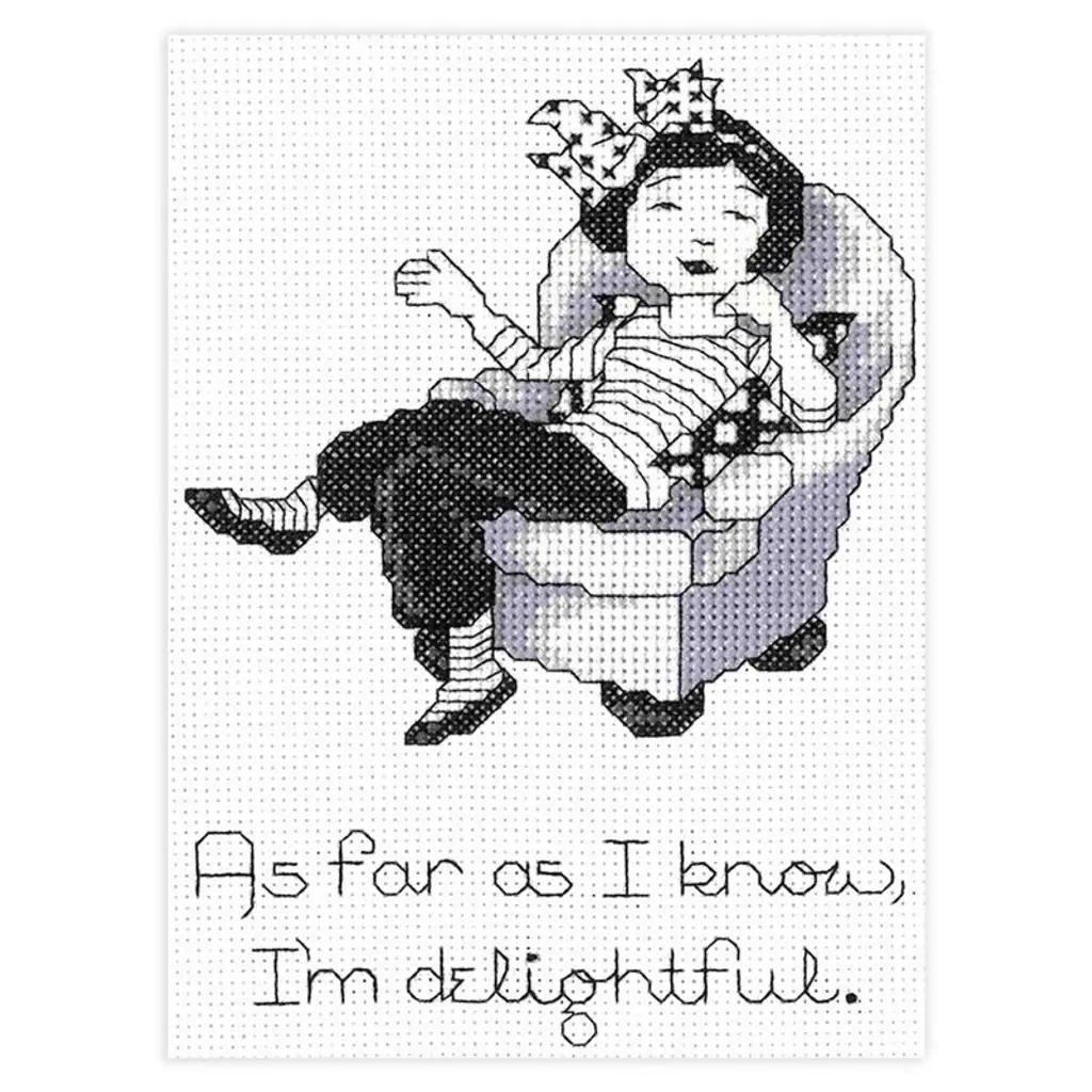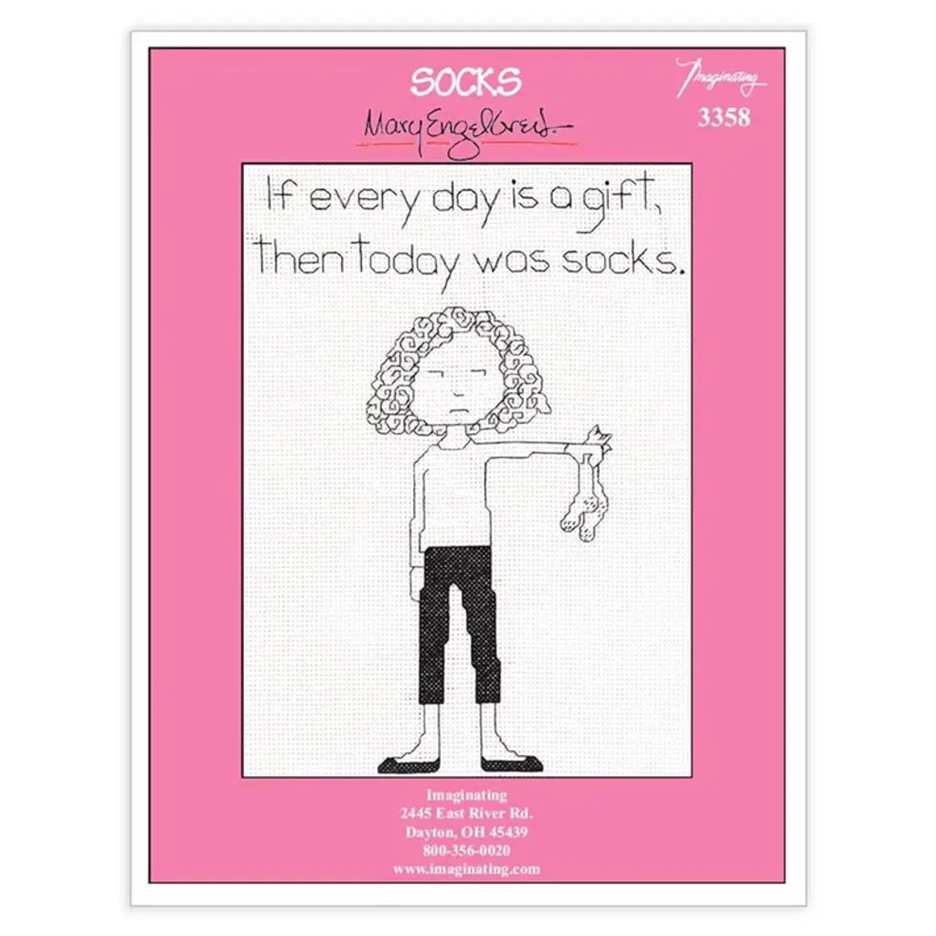From Mary Engelbreit's "Engeldark" line this project is all about just having "one of those days" Design includes full stitches, backstitching, French knots and quarter stitches. Socks is designed to be stitched on 14ct White Aida fabric and uses 2 different colors of floss. Leaflet only (instructions) Finished size 6.5" x 8.8" Reads: If every day is a gift, then today was socks. Model Specifications Stitch count: 83 w x 117 h Project size: 6.5" x 8.8" on 14 ct Floss: 2 DMC floss colors Fabric: 14 ct White Aida