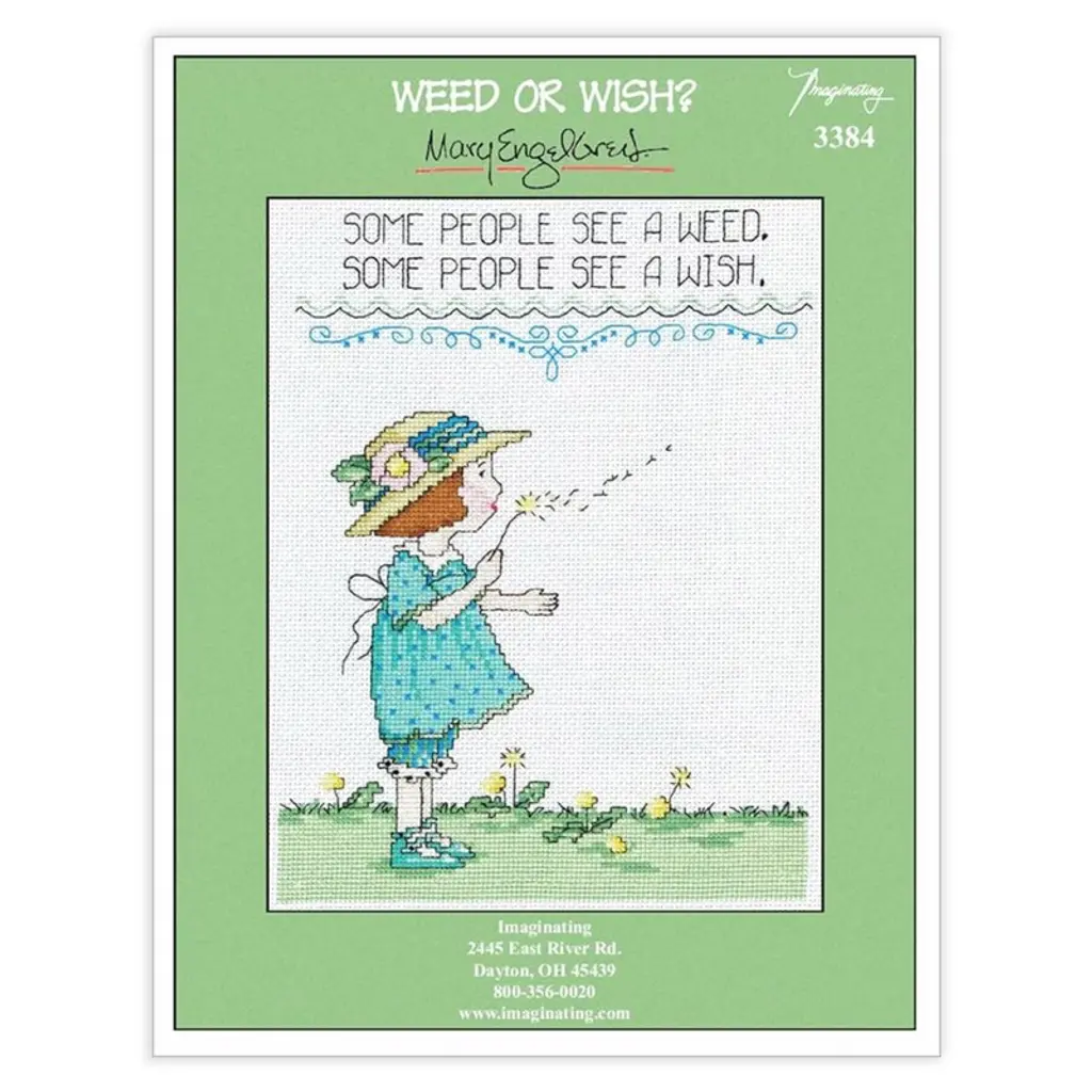 An adorable reminder that things aren't always what they seem. Project includes full stitches, quarter stitches, backstitching and French knots. Weed or Wish is designed to be stitched on 14ct Light Blue Aida fabric and uses 24 different colors of floss. - Kit includes: instructions, floss, fabric, needle - Reads: Some people see a weed, some people see a wish. Model Specifications: - Stitch Count: 108w x 139h - Project Size: 7.7" x 9.9" on 14cnt - Floss: 24 DMC floss colors - Fabric: 14ct Light Blue AidaAn adorable reminder that things aren't always what they seem. Project includes full stitches, quarter stitches, backstitching and French knots. Weed or Wish is designed to be stitched on 14ct Light Blue Aida fabric and uses 24 different colors of floss. Kit includes: instructions, floss, fabric, needle Reads: Some people see a weed, some people see a wish. Model Specifications: Stitch Count: 108w x 139h Project Size: 7.7" x 9.9" on 14cnt Floss: 24 DMC floss colors Fabric: 14ct Light Blue Aida