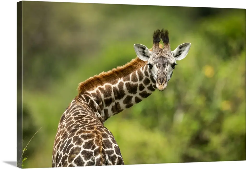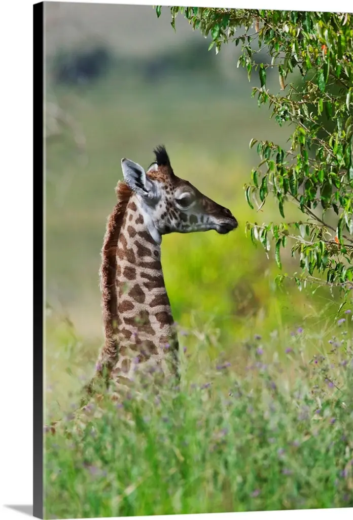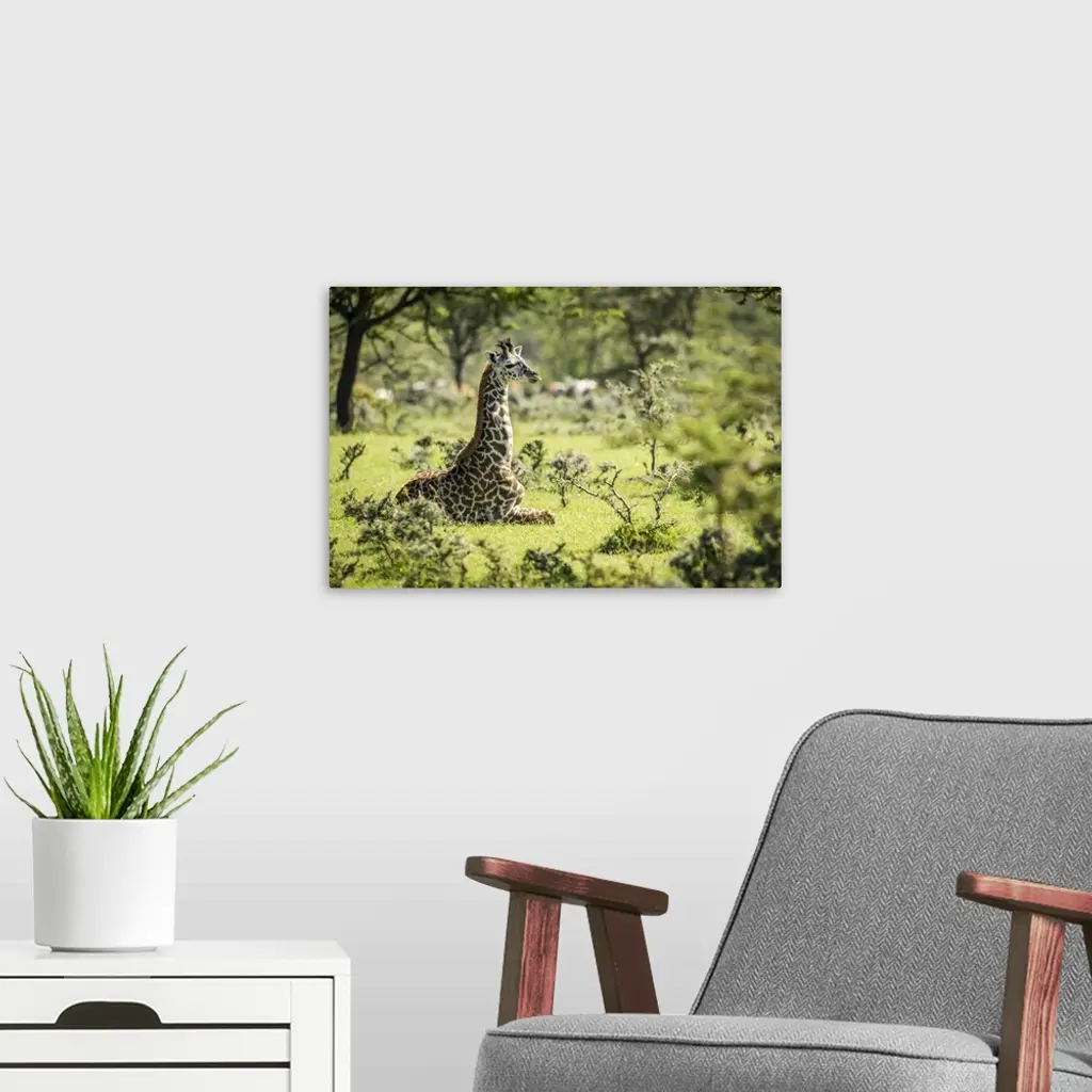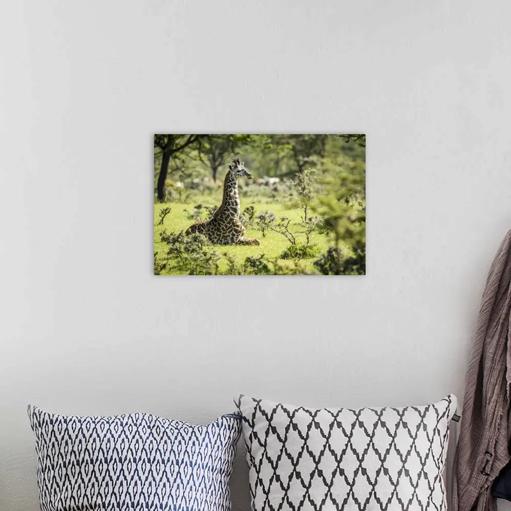 Masai Giraffe Kneeling In Grass Among Bushes, Serengeti National Park, Tanzania