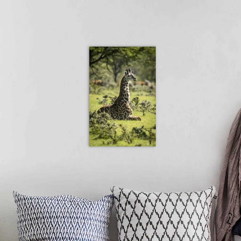 Masai Giraffe Kneeling In Grass Among Bushes, Serengeti National Park, Tanzania