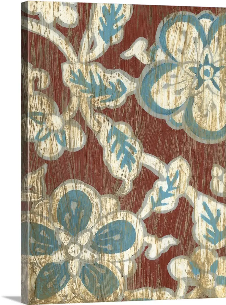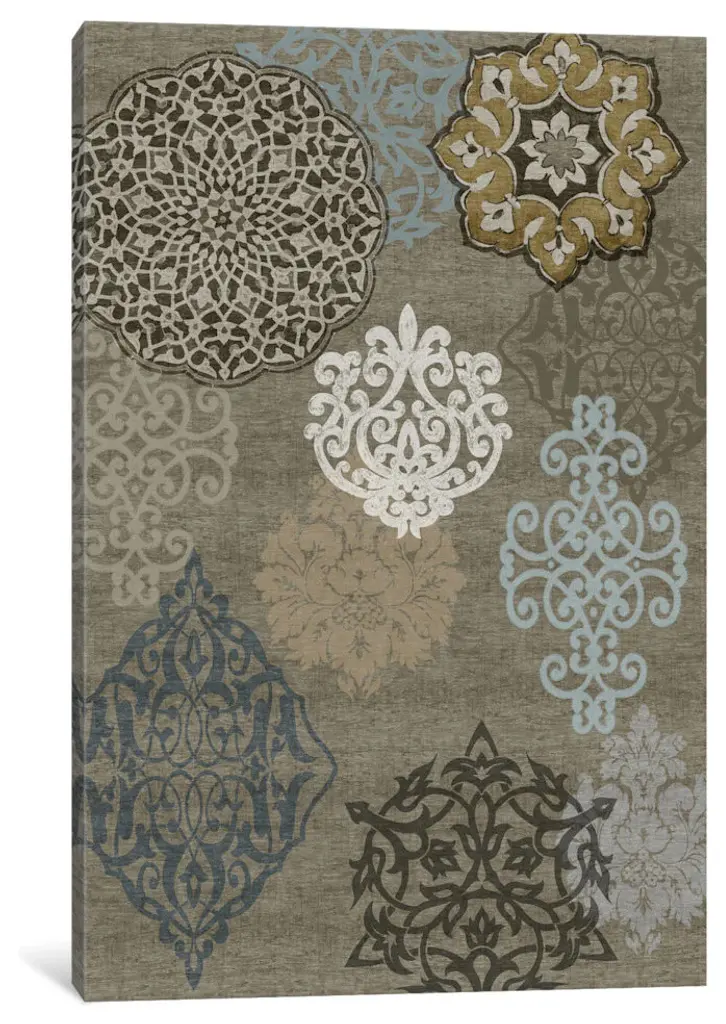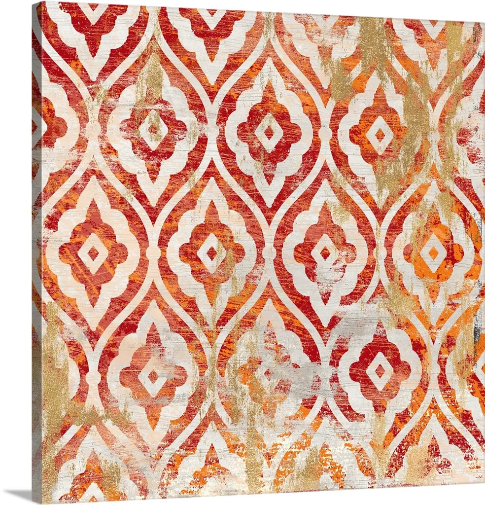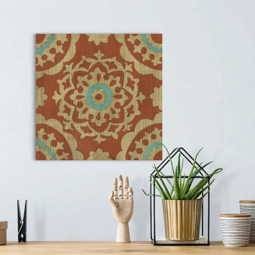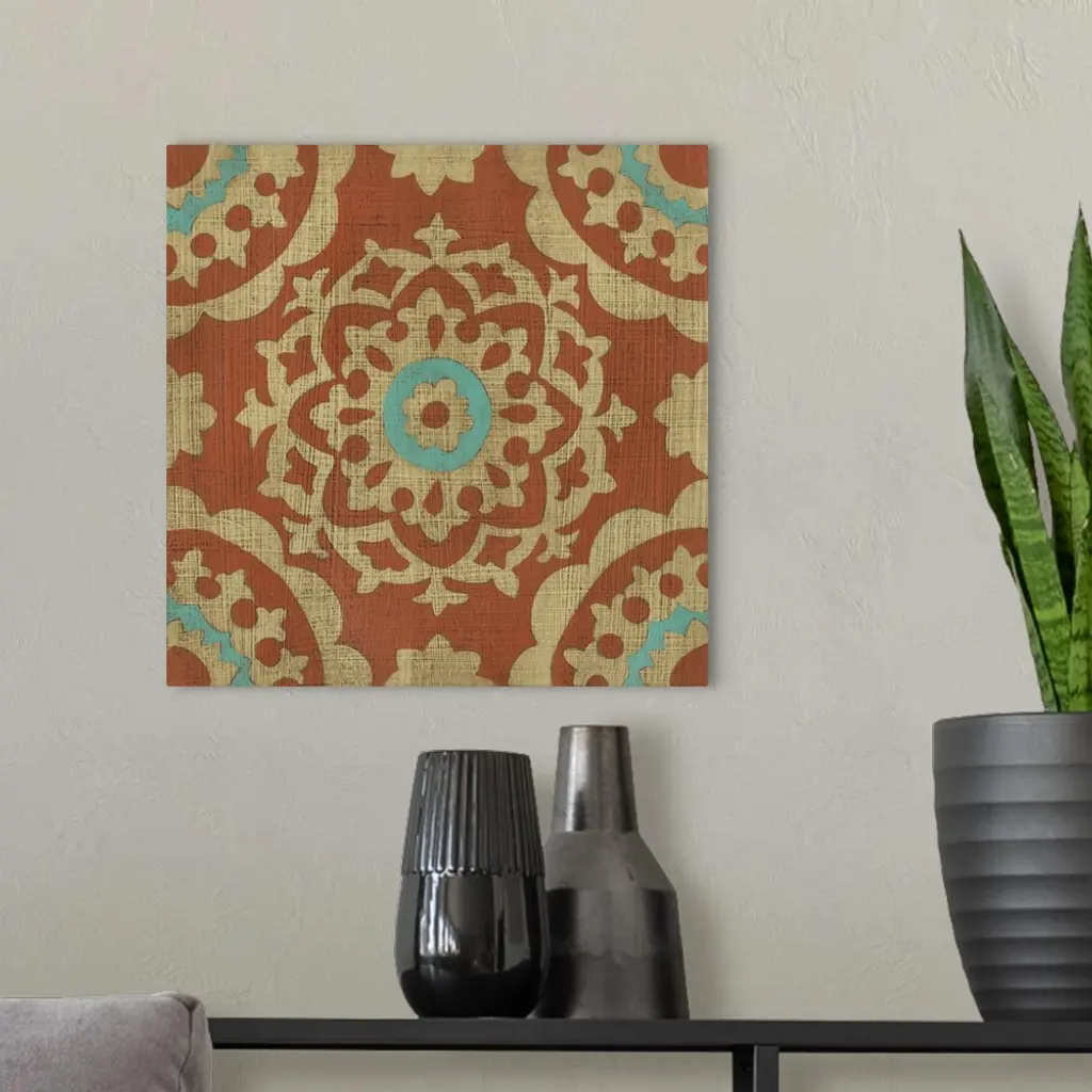 Kaleidoscope patterns in earthy oranges and bright blues fill a cross hatched background resembling burlap material.