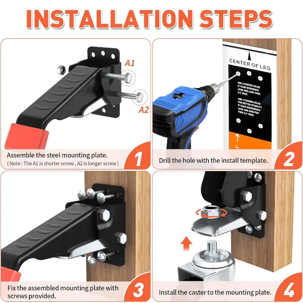 Transform your workbench into a mobile workstation with MaseiKar Heavy-Duty Retractable Casters! Built with reinforced steel and premium bearings, this set of 4 supports 660 lbs and installs easily with the included template — no measuring needed. The 2.5-inch polyurethane wheels offer smooth, scratch-resistant movement on any floor, while the 360° rotation ensures effortless maneuvering. A step-down foot pedal lets you lift and lower your bench with ease, making it perfect for heavy tables, machinery, and workbenches.