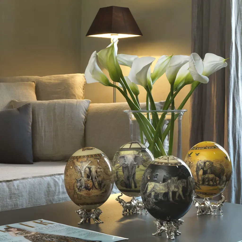 This exclusive object is made in the tradition of painted ostrich eggshells, supported by a sophisticated base and graced with masterfully interpreted African scenes. The egg is lavishly decorated with delicate ink decals of the symbolic animals of the Savanna, while the base, made of sterling silver, features three lions made with the cire perdue technique. The wonderful colors are the result of approximately fifty layers of paint that require 10-15 days to complete. This is a coveted item for any collector.