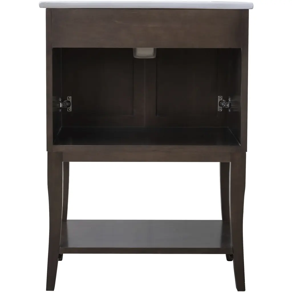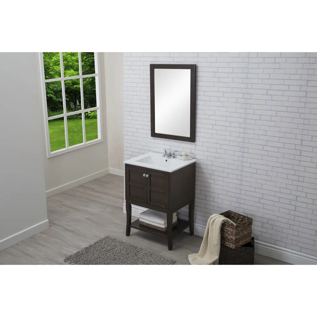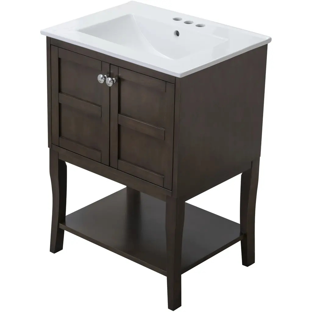 Designed with simple beauty and clean lines in mind , the Mason vanity will surely bring a unique flair to the modern day guest or office bathroom. Its transitional design Features 2 framed doors with soft close function and an open shelf for your additional bathroom essential, topped with a modern white porcelain counter top with an integrated sink, which ensure non stain, scratch resistance and maintenance free use. the cabinet is painted in modern white, accented with round stainless steel door knobs, and build by solid wood frame, with graciously curved legs. Features: Mason collection Porcelain top with integrated sink Measurements: W24xD18xH34in. Cabinet finish: antique coffee 4in. spread ready to install faucet hole 2 doors and 1 shelf Door knob finish: chrome Build with solid wood and wood veneer. PRODUCTS DETAIL: Top material: porcelain Sink: porcelain Base material:wood Faucet: not included Door included: 2 Shelf: 1 installation: required.