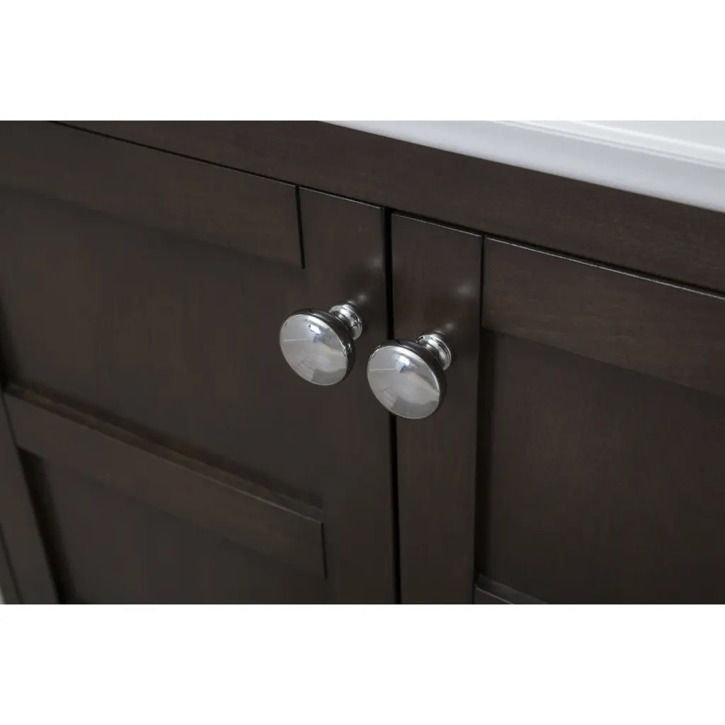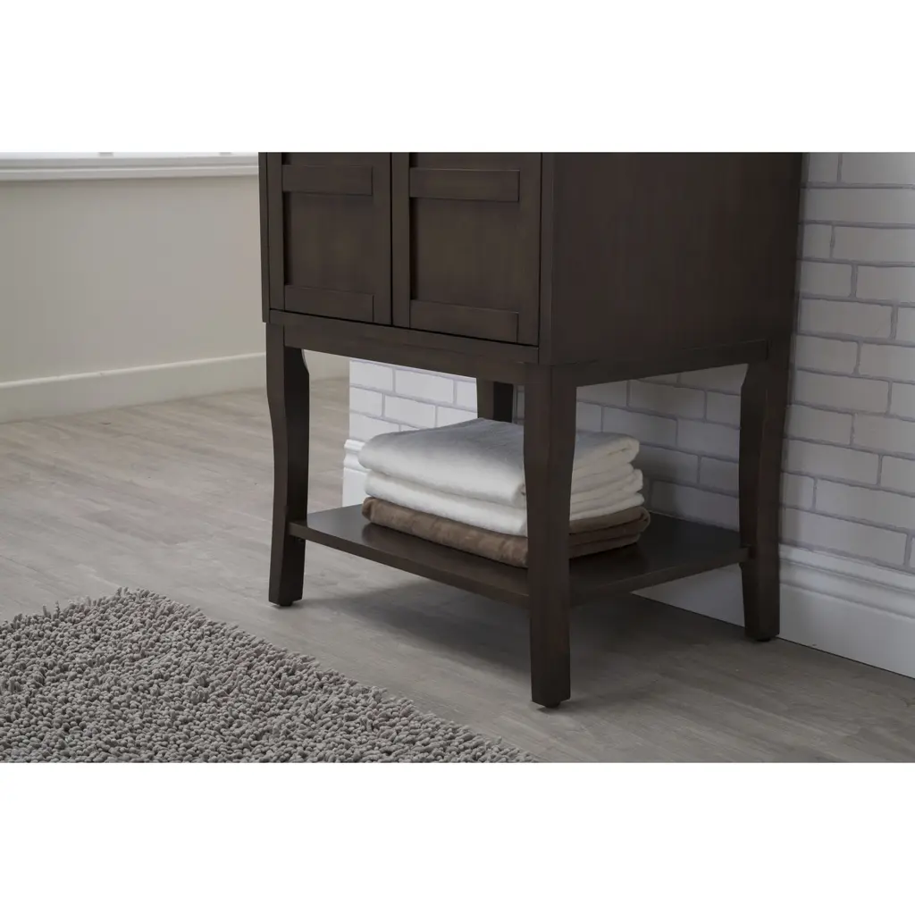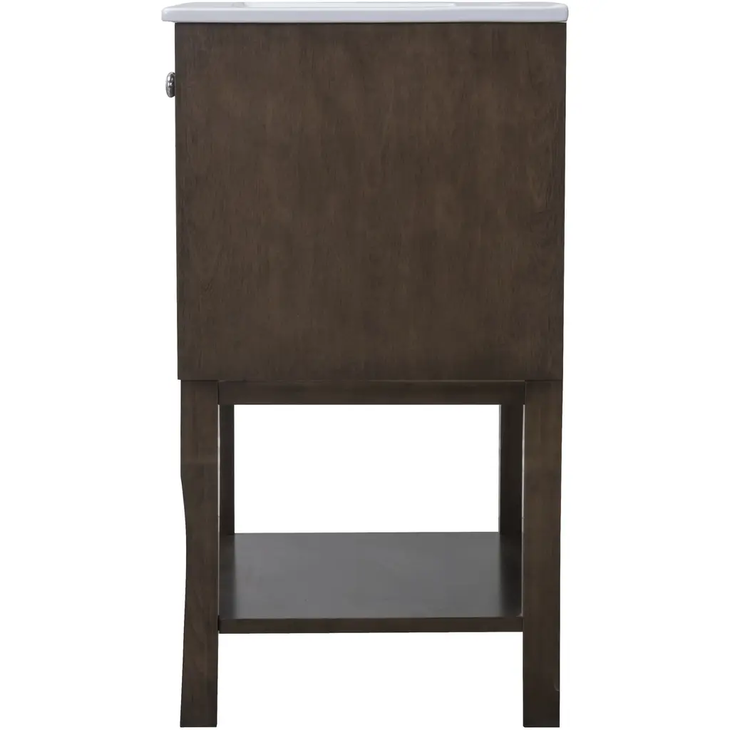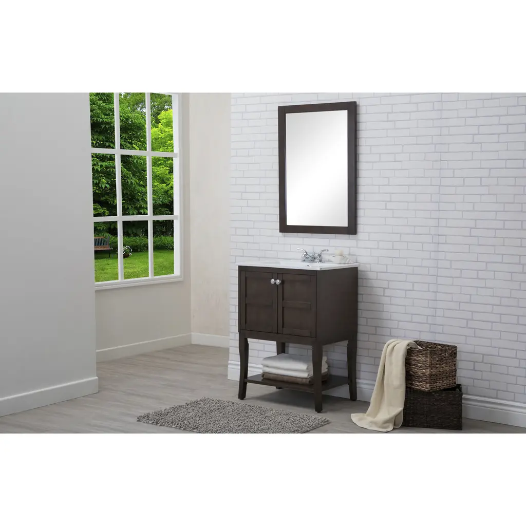 Designed with simple beauty and clean lines in mind , the Mason vanity will surely bring a unique flair to the modern day guest or office bathroom. Its transitional design Features 2 framed doors with soft close function and an open shelf for your additional bathroom essential, topped with a modern white porcelain counter top with an integrated sink, which ensure non stain, scratch resistance and maintenance free use. the cabinet is painted in modern white, accented with round stainless steel door knobs, and build by solid wood frame, with graciously curved legs. Features: Mason collection Porcelain top with integrated sink Measurements: W24xD18xH34in. Cabinet finish: antique coffee 4in. spread ready to install faucet hole 2 doors and 1 shelf Door knob finish: chrome Build with solid wood and wood veneer. PRODUCTS DETAIL: Top material: porcelain Sink: porcelain Base material:wood Faucet: not included Door included: 2 Shelf: 1 installation: required.