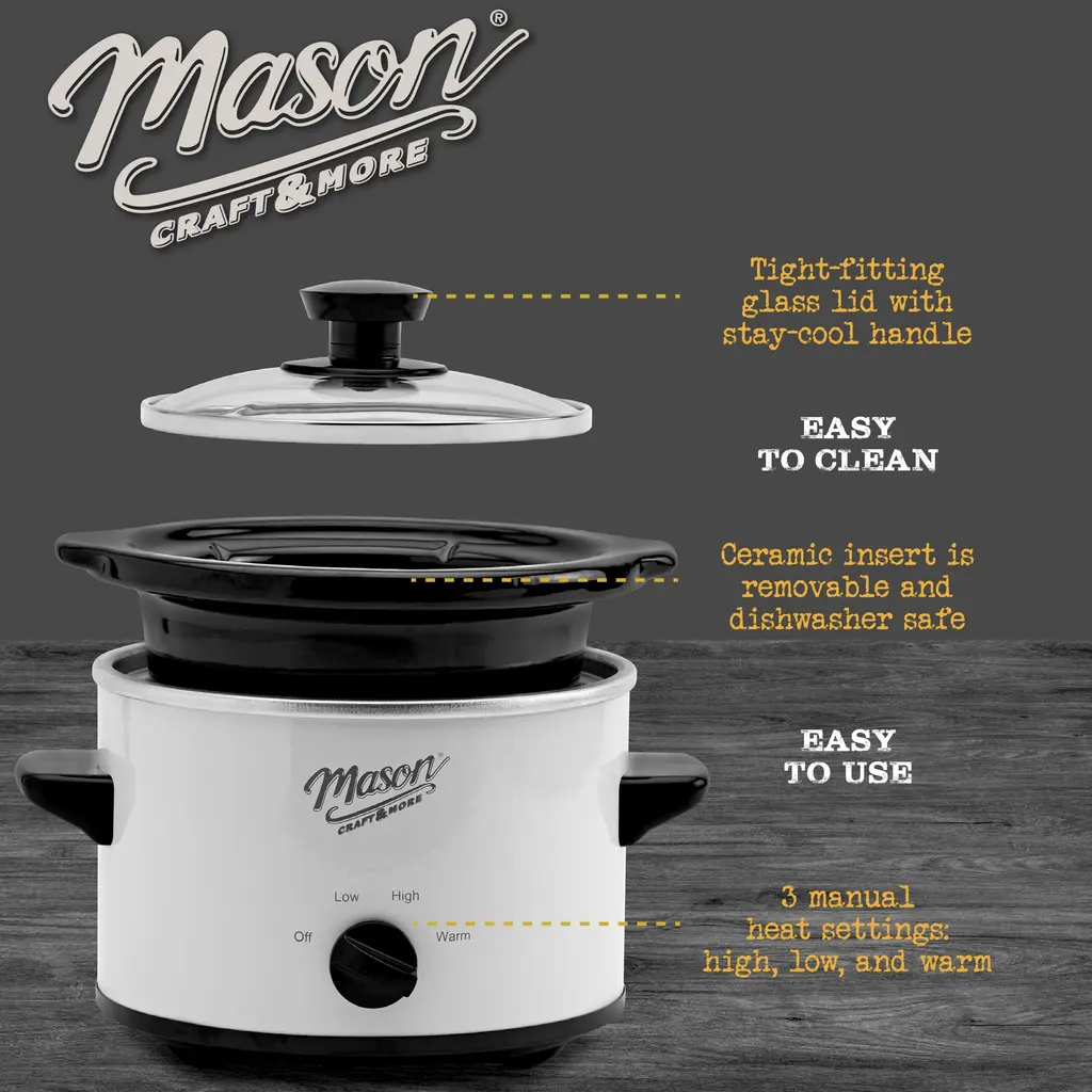 Prep your ingredients and relax while your favorite meals cook on the counter with this 1.5-quart slow cooker from Mason Craft & More. Designed for tasty and convenient dinners, this slow cooker features a simple-to-use 3-setting system and a tight-fitting glass lid. This cooker is great for cooking ribs, pot roasts, shredded chicken, pulled pork, and a variety of stews and pasta dishes. The removable ceramic insert is also dishwasher safe for quick and easy cleaning after enjoying your delicious dinner.