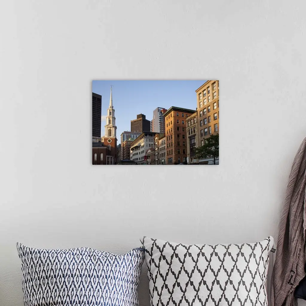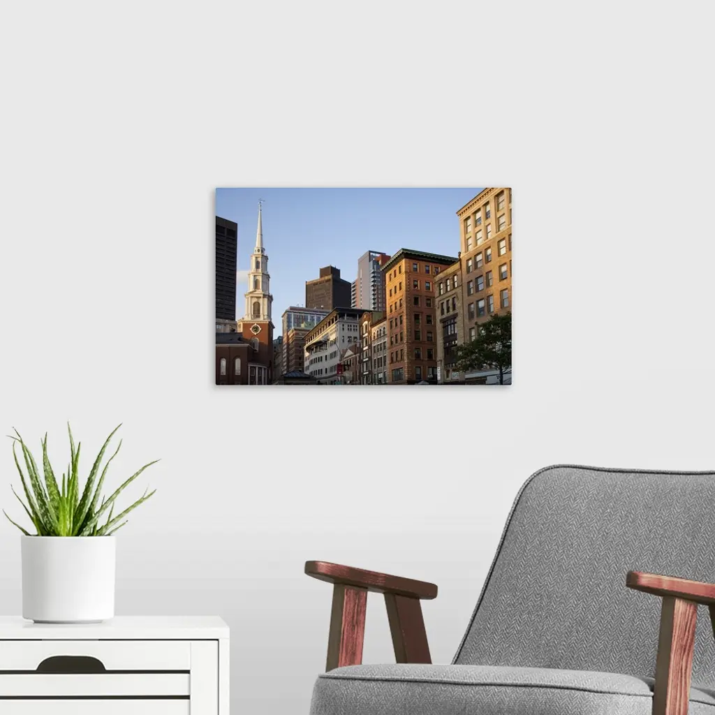 USA, Massachusetts, Boston, Old North Church and city skyline on s[ring evening