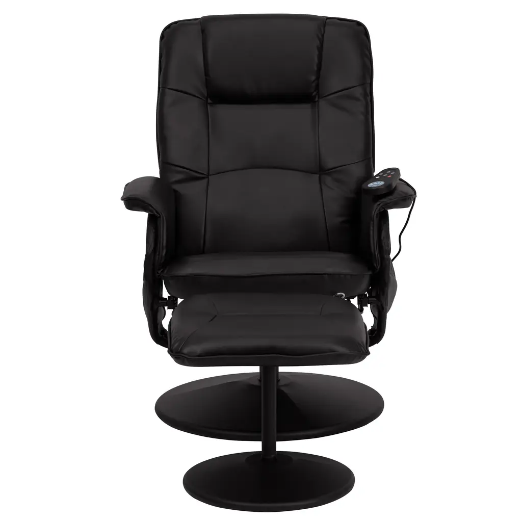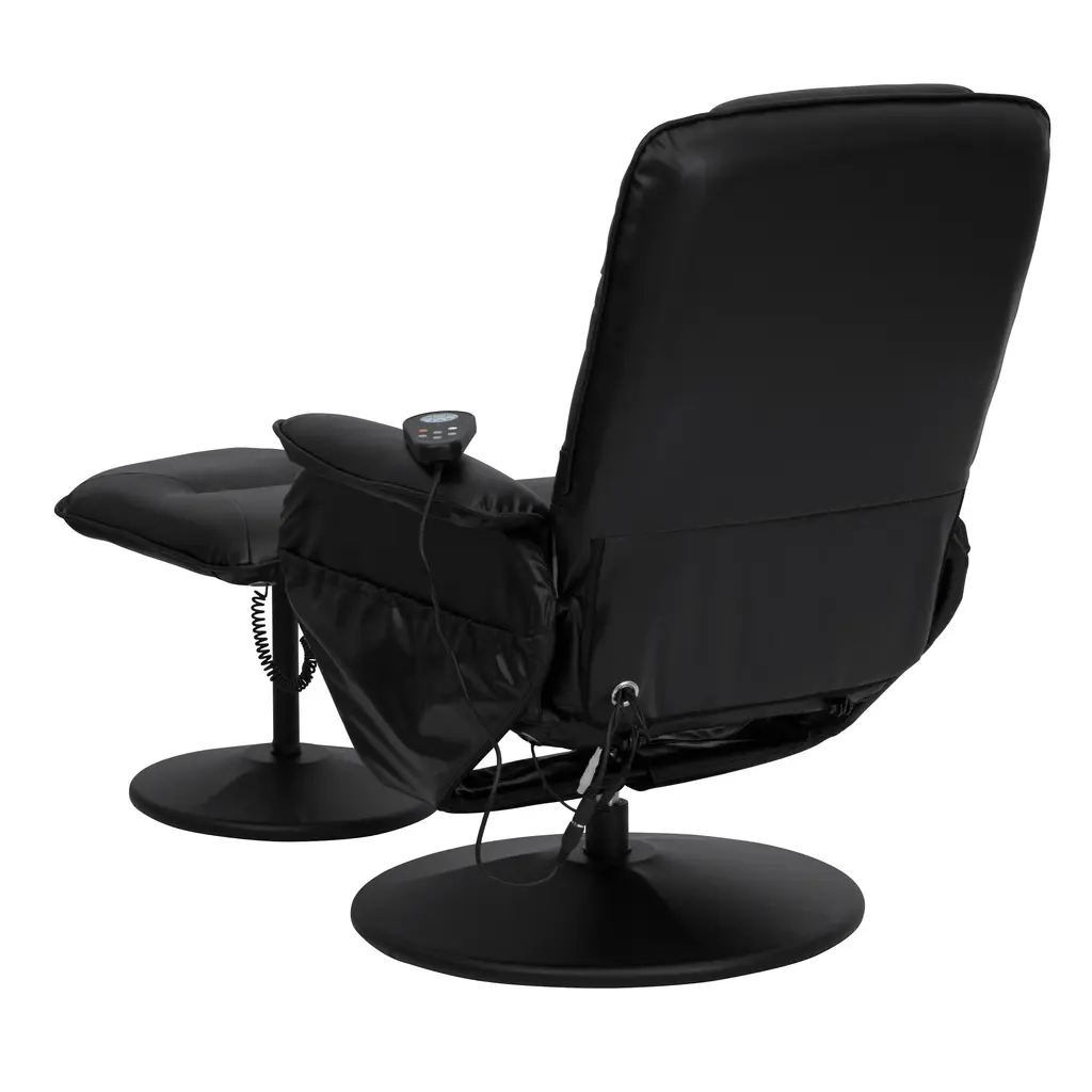 If you are looking for a recliner with a modern and classy look that is also comfortable and therapeutic, your search is over! Enjoy a relaxing massage in the comfort of your own home or office with this recliner and ottoman set featuring a swivel seat and and reclining back that adjusts with the force of your weight. Beautifully designed, this recliner is soft to the touch and exceptionally comfortable while deep side pockets hold all of your lounging necessities. This set offers maximum massaging power that massages your back, lumbar area and thighs. With three intensity levels and five massage modes you are sure to get the comfort that you're looking for. Take care of any spills with a water-based cleaner. Look no further for your perfect massage chair offered at an incredible price!
