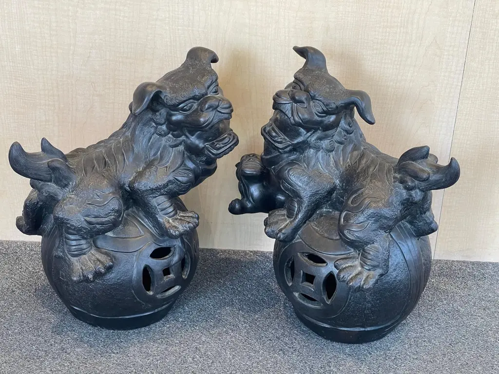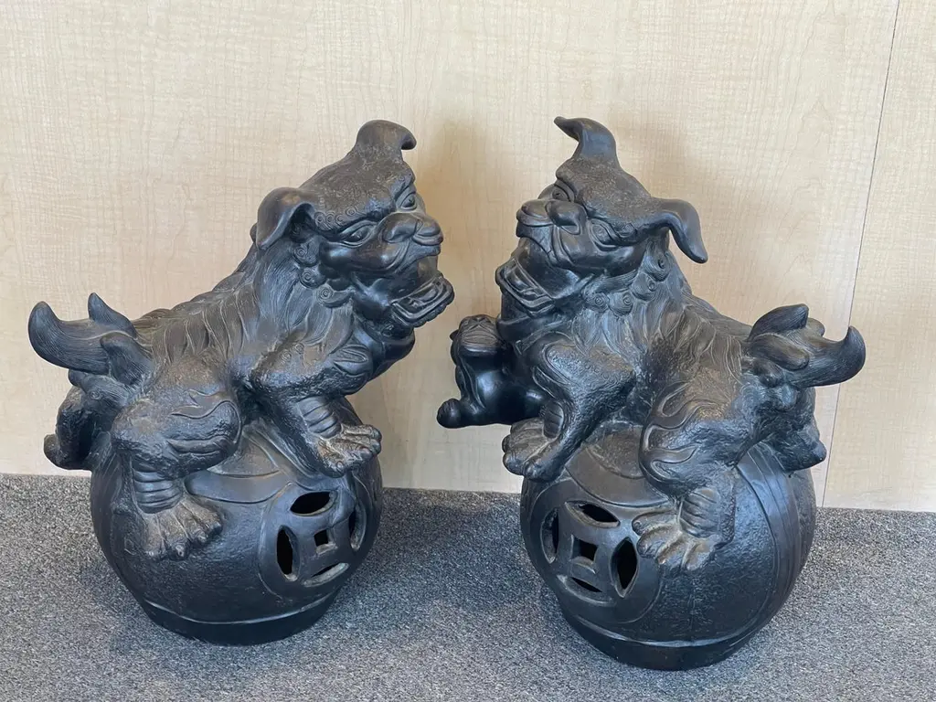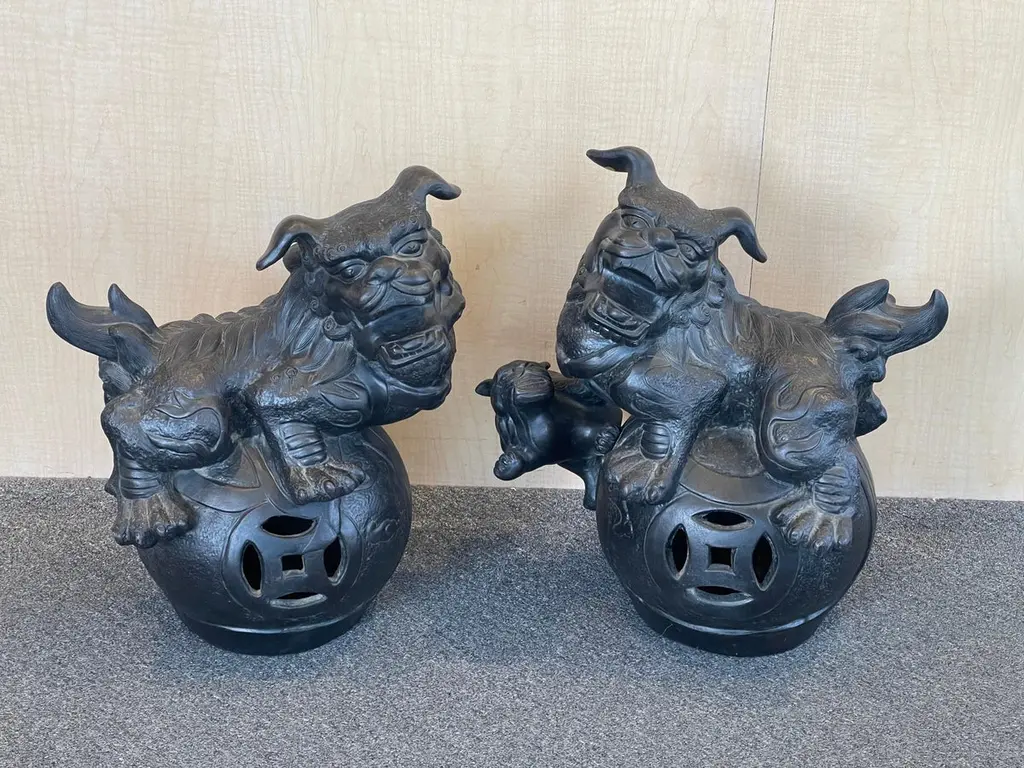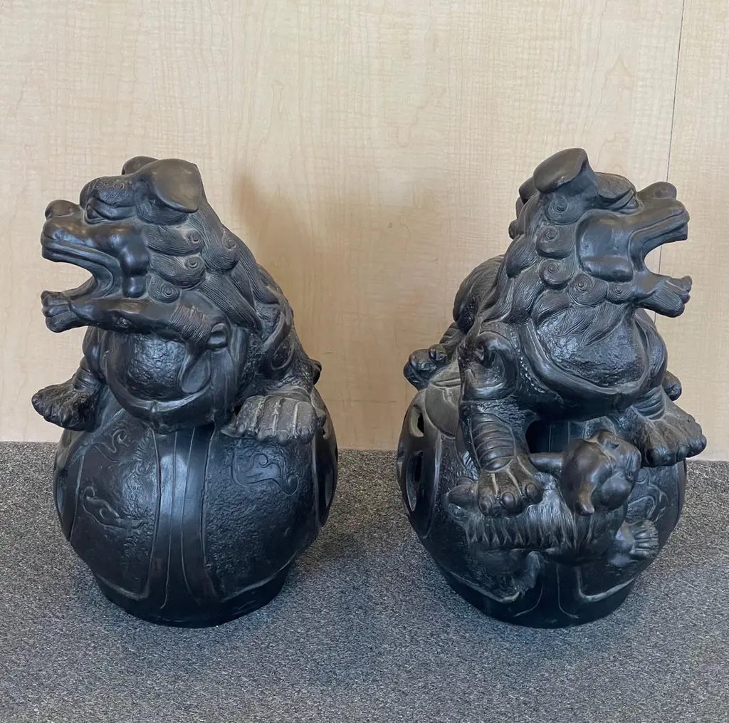 Incredible, massive pair of ebonized pottery Chinese foo dogs, circa 1950s. This unusual pair are finely crafted with amazing detail sitting on xiu qiu play balls. #1873Overall condition is excellent with great color and patina; each dog measures approximately 18.5"H x 16"W x 11.5"D. They are huge!These dogs would make a wonderful edition to any foo dog collection or as a Chinese decorative accent!