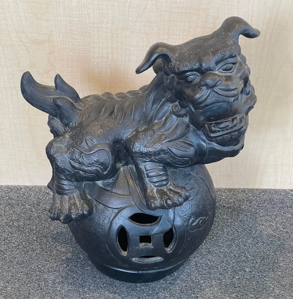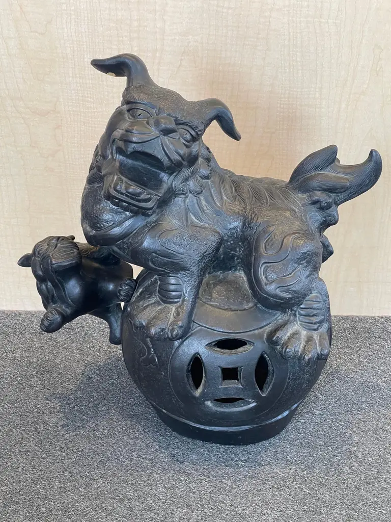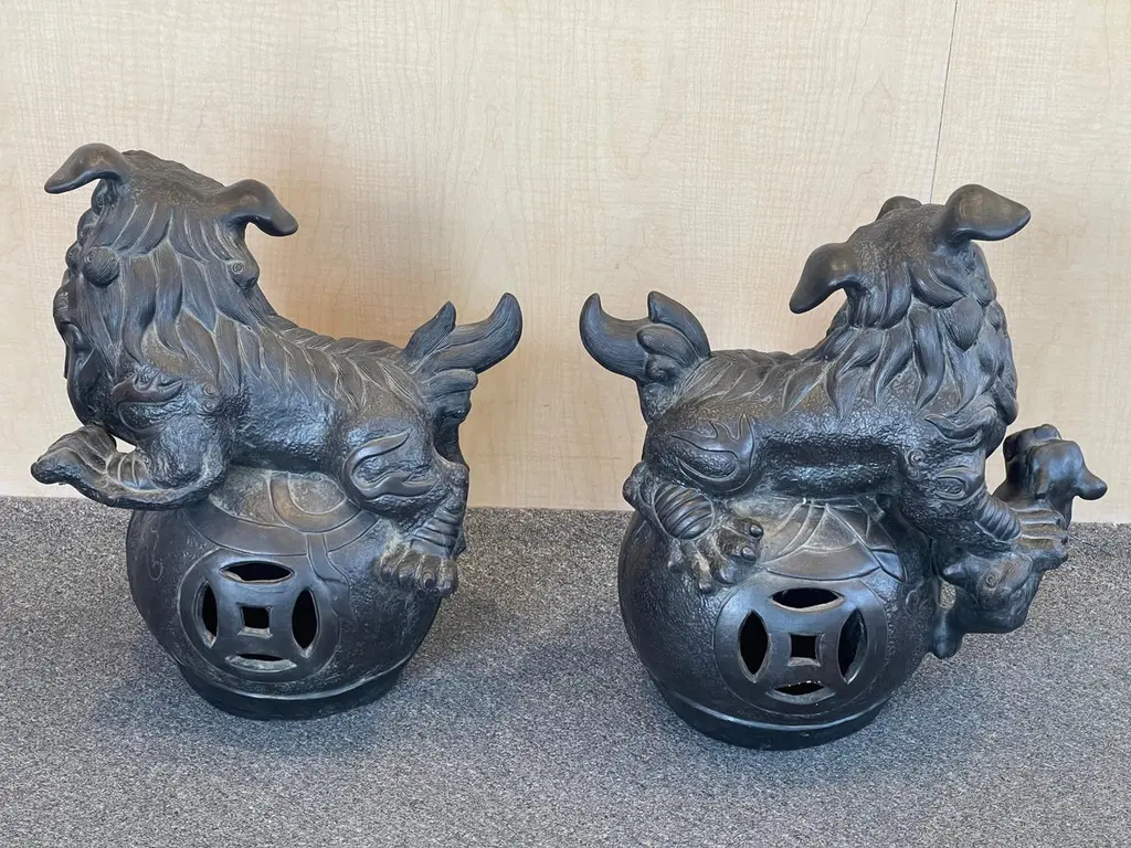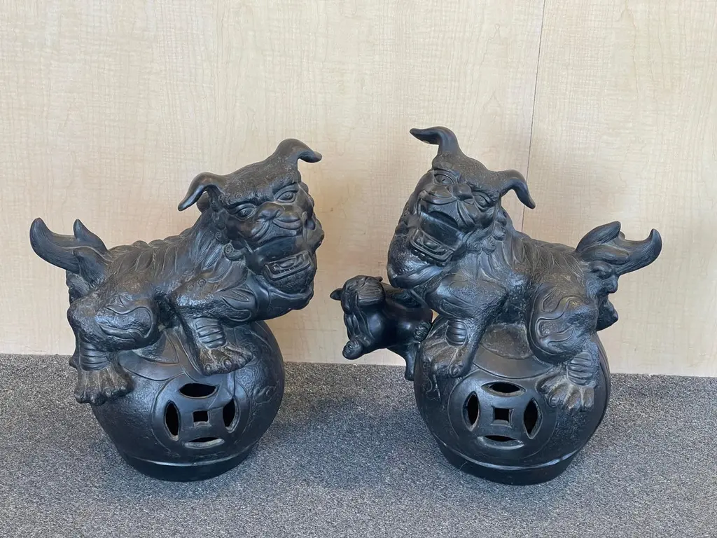 Incredible, massive pair of ebonized pottery Chinese foo dogs, circa 1950s. This unusual pair are finely crafted with amazing detail sitting on xiu qiu play balls. #1873Overall condition is excellent with great color and patina; each dog measures approximately 18.5"H x 16"W x 11.5"D. They are huge!These dogs would make a wonderful edition to any foo dog collection or as a Chinese decorative accent!