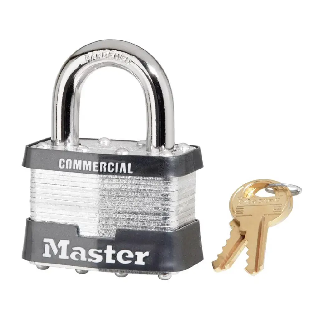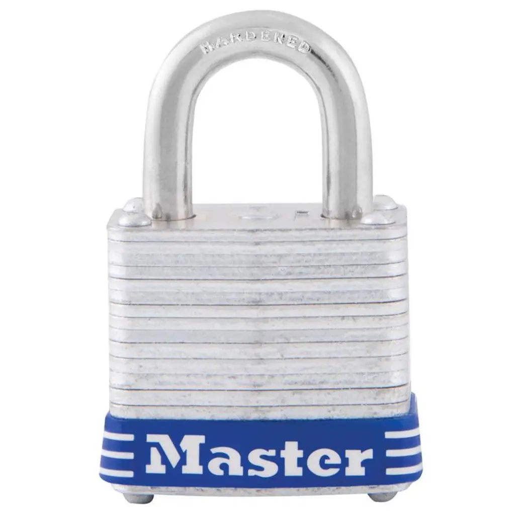The Master Lock No. 3D Laminated Padlock features a 1-9/16in (40mm) wide laminated steel body for maximum strength and reliability. The 9/32in (7mm) diameter shackle is 3/4in (19mm) long and made of hardened steel, offering extra resistance to cutting and sawing. The 4-pin cylinder prevents picking and the dual locking ball bearings provide resistance against prying and hammering.