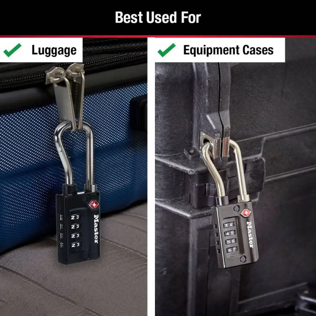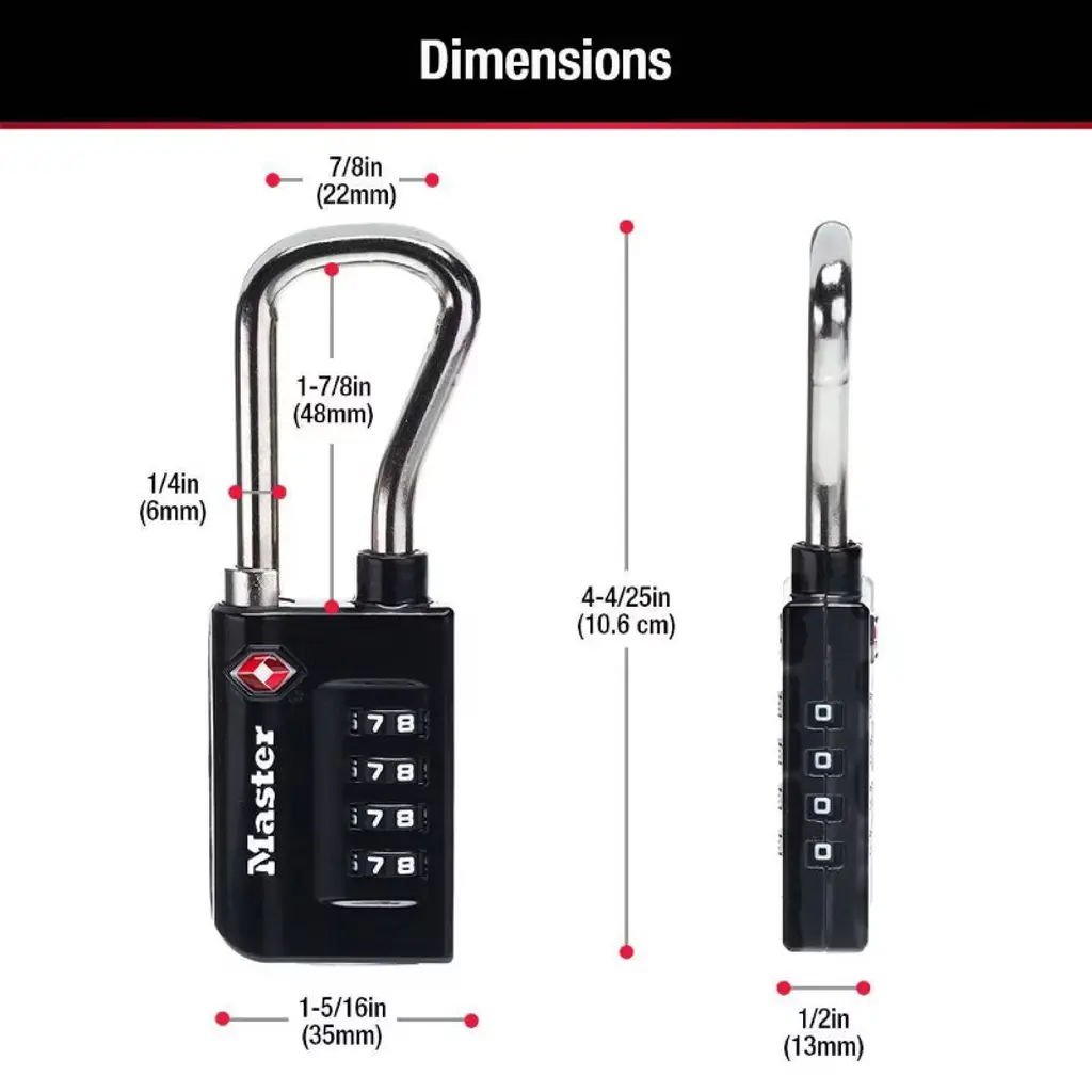 The Master Lock no. 4696D set your own combination TSA-Accepted luggage lock features a 1-5/16 In. (35 mm) wide metal body for durability. The 1/4 In. (6 mm) diameter shackle is 1-7/8 In. (48 mm) long, offers extended reach for use on equipment cases and is made of steel, offering resistance to cutting and sawing. Transportation security administration (TSA) screeners can open, inspect and elocks bags and cases locked with a TSA-Accepted lock. Lock your checked baggage with the lock TSA screeners won’t cut! The limited lifetime warranty provides peace of mind from a brand you can trust