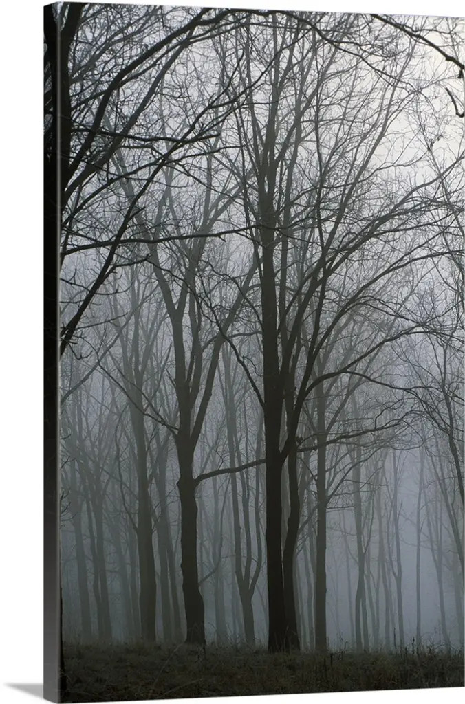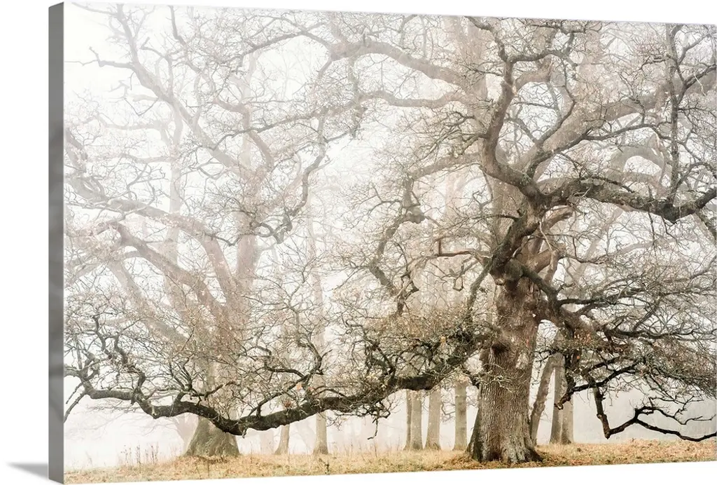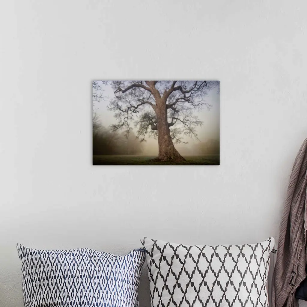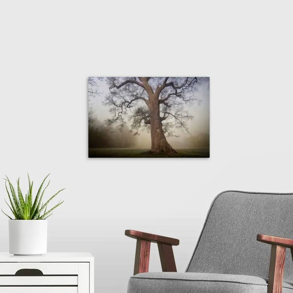 Docor wall art for the home or office an ancient tree stands alone in a misty field in this landscape photograph.