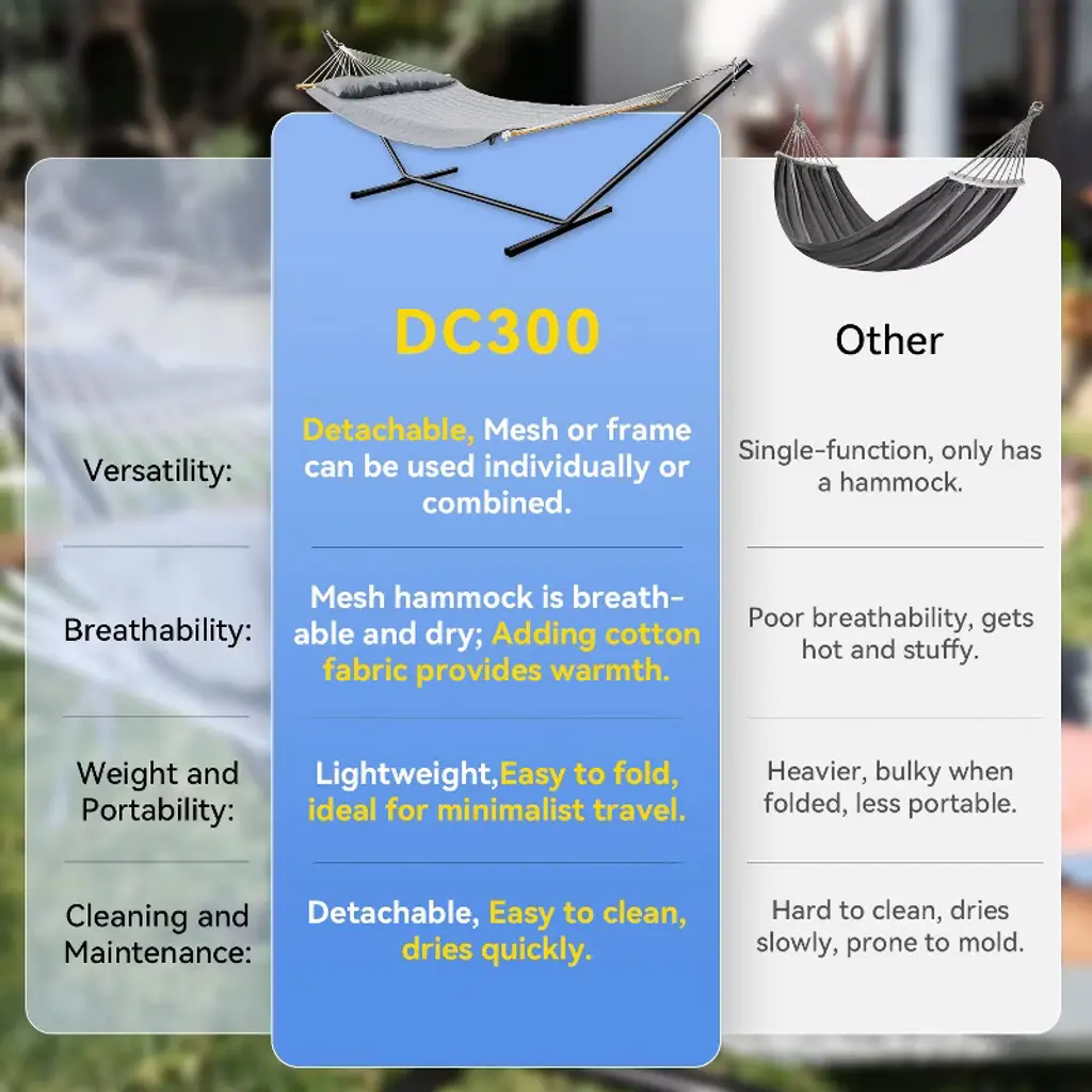 Mastgoal Double Hammock with Stand, a perfect blend of comfort, durability, and convenience. This hammock is designed to enhance your relaxation experience, whether you're at home or on the go. Embrace a leisurely lifestyle with the Mastgoal Double Hammock with Stand. It's suitable for multiple scenarios, whether you want to read a book under the sun, take a nap in the shade, or just enjoy the outdoors with your loved ones.