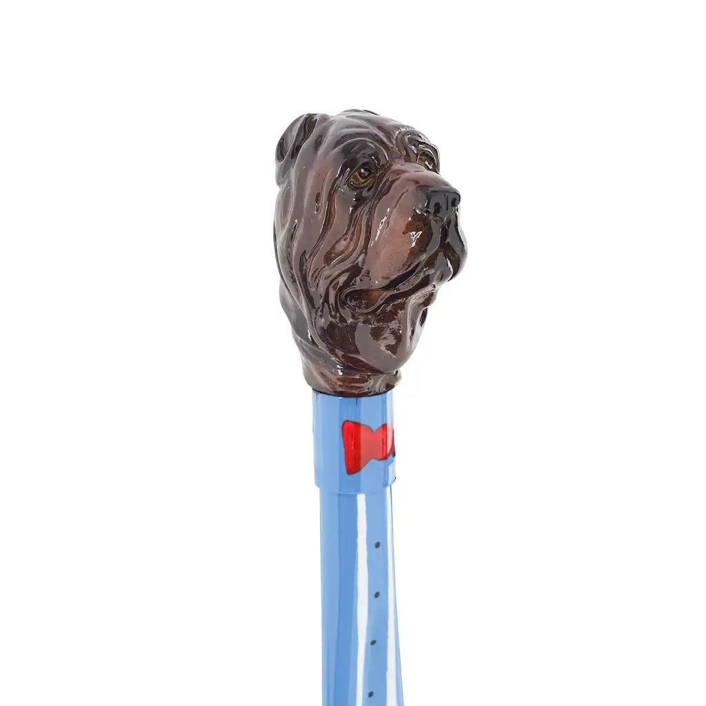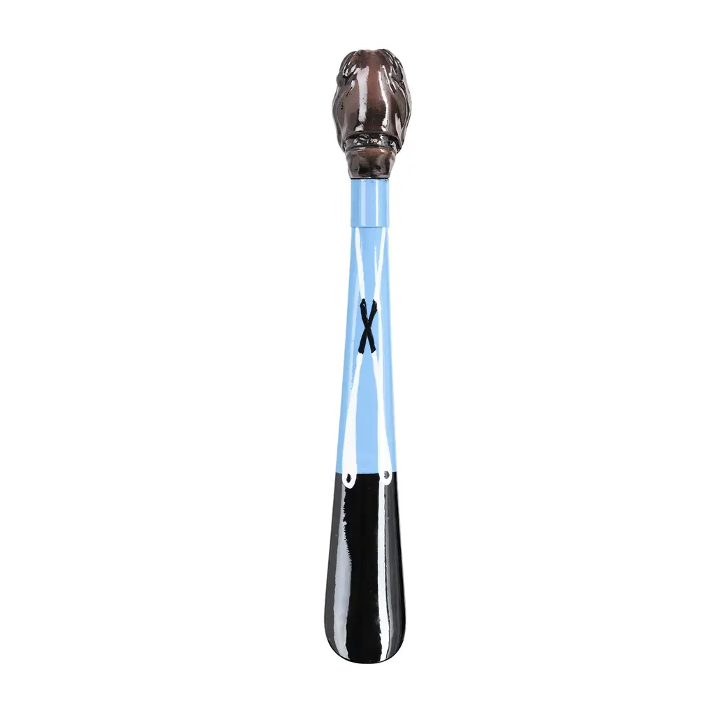 This stylish shoehorn brimms with the fierce character of a mastiff, here reinterpreted in a playful version where the ABS paddle is minutely hand-decorated to resemble a black and azure suit completed by a red bow tie painted on the brass ring. The zoomorphic handle in marble powder is rendered in exquisite detail for a captivating realistic look. The design comes in a refined box.
