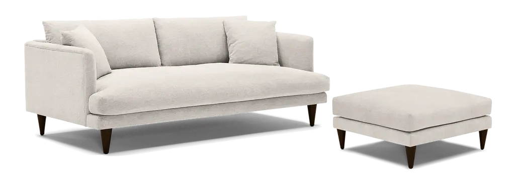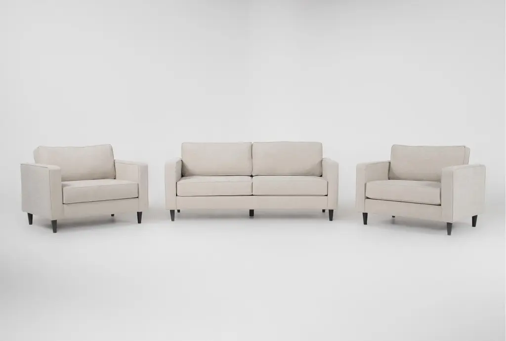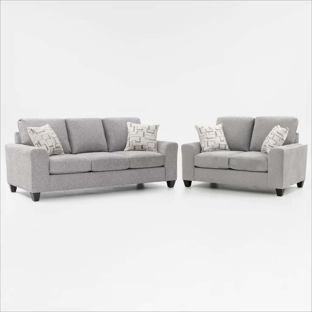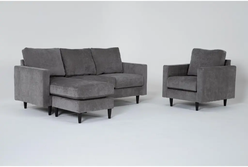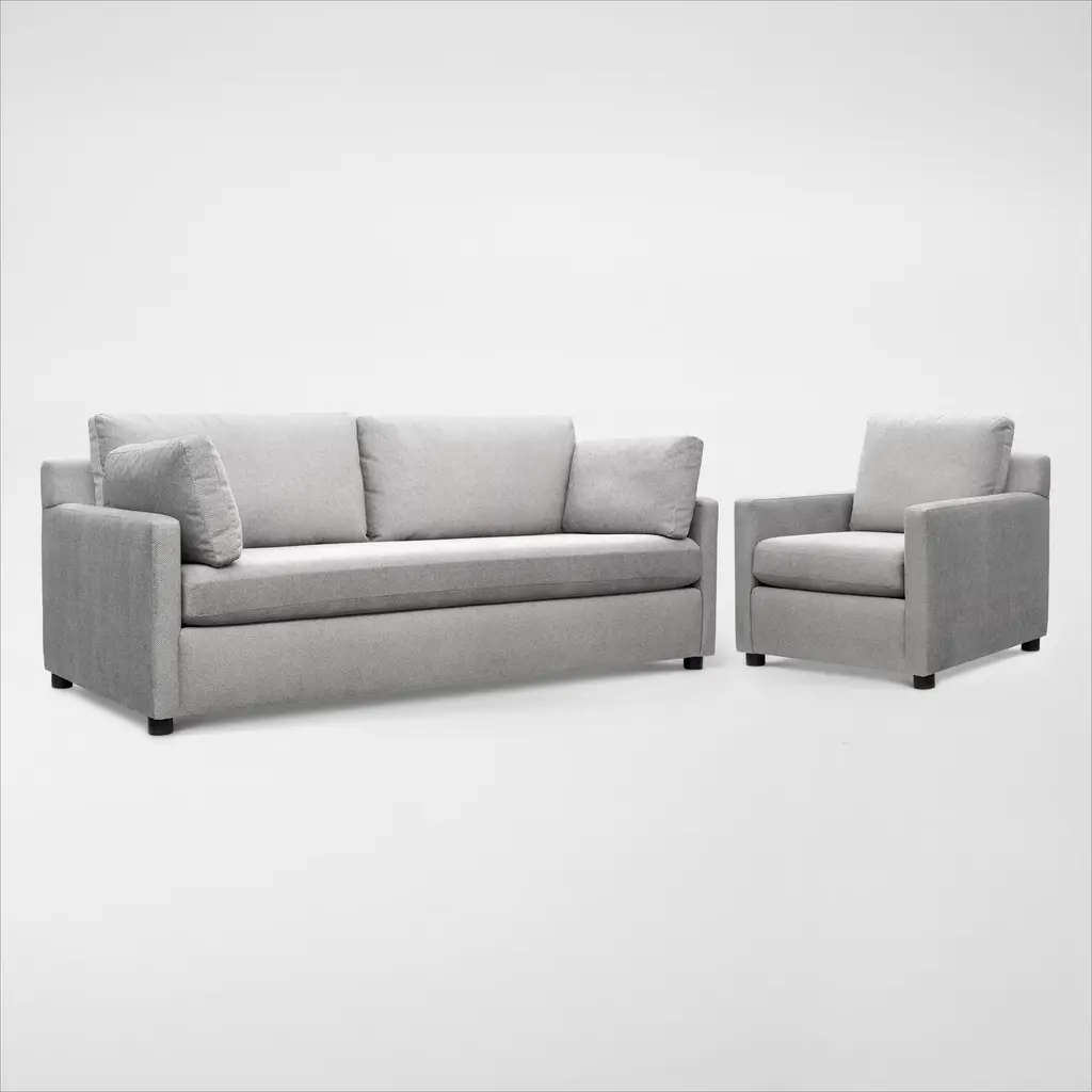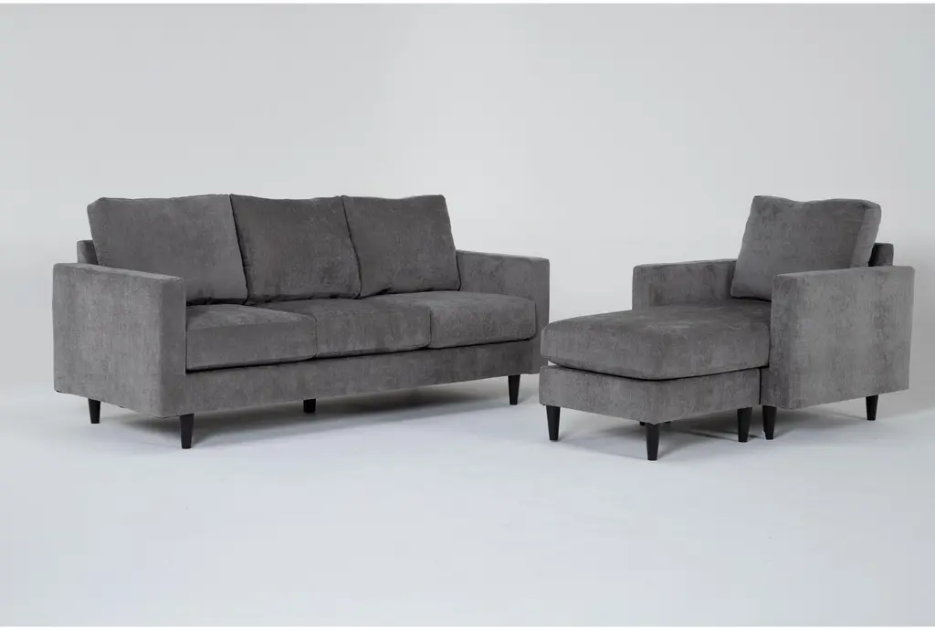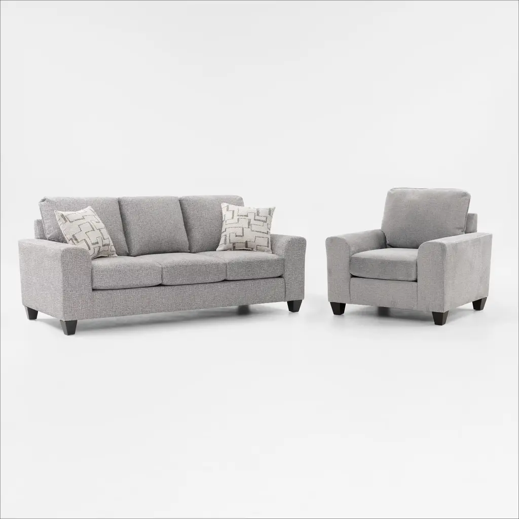 Enhance your living room with the Mathers Oyster Grey Fabric 91" Sofa paired with the Lucca Blue Fabric Accent Chair & Ottoman. This modern set combines comfort and style, featuring soft polyester fabric and supportive foam cushions. The sleek track arms and tapered legs add a contemporary touch to your space.
