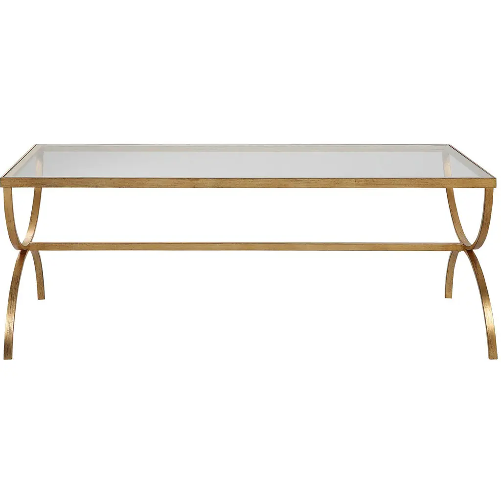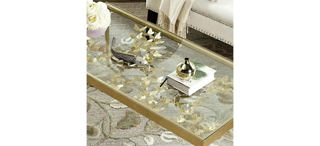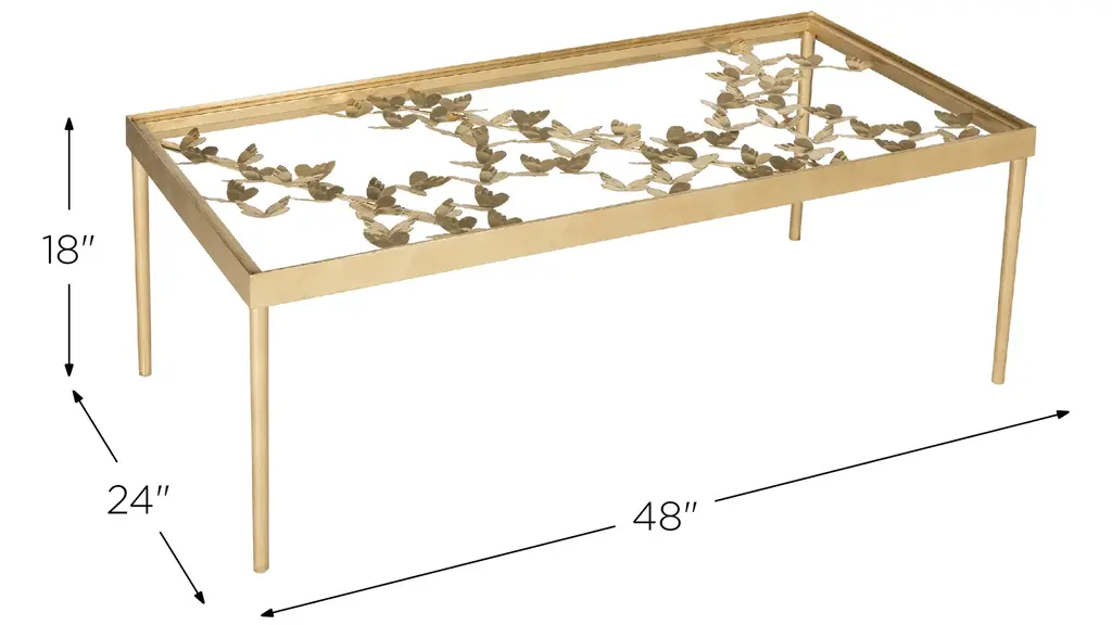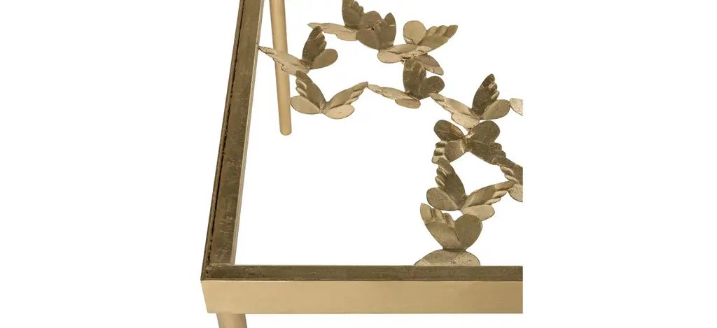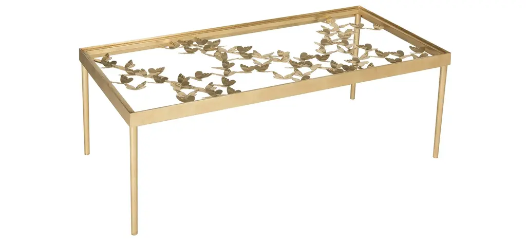 This butterfly Matilda coffee table was inspired by a handcrafted piece created by master goldsmiths for an Italian princess' Tuscan estate. Ethereal and timeless, this modern heirloom's antique gold finish, glass top and sculptural detail bring visual splendor to any decor.
