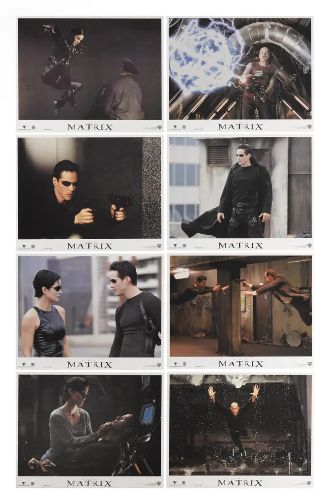 Original US set of 8 Lobby cards for the science fiction classic The Matrix, 1999.The film was directed by Andy Wachowski & Lana Wachowski.The would be shipped flat in a very strong pack by Federal Express.
