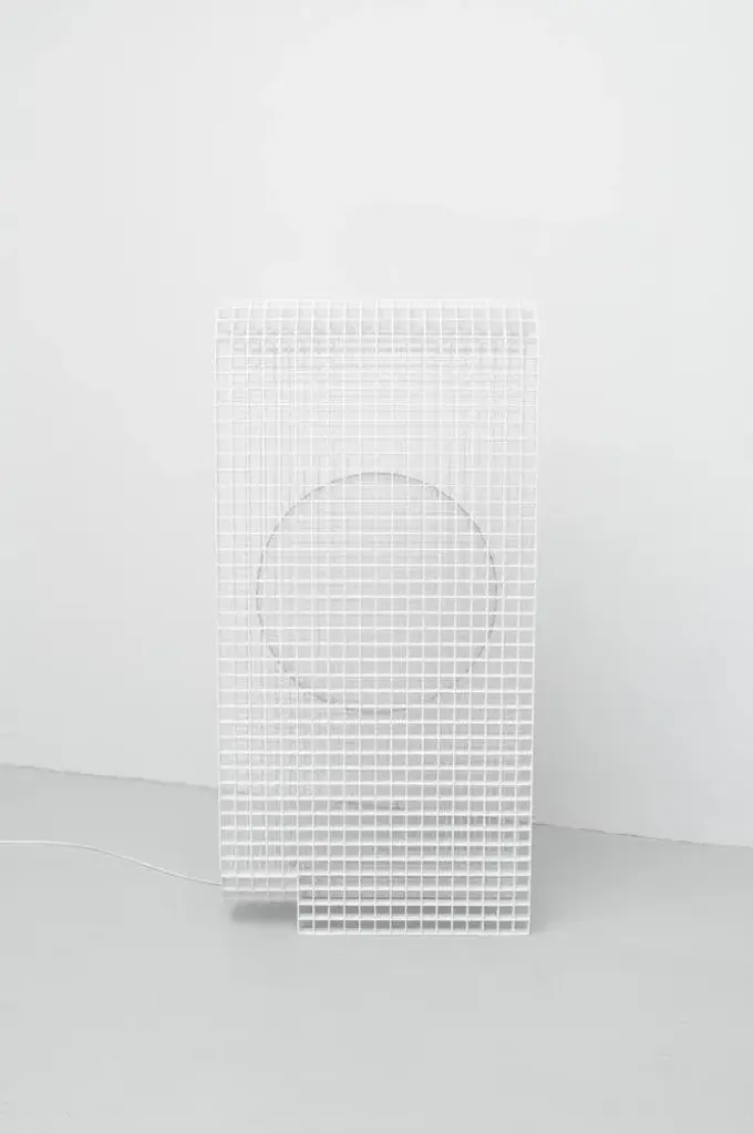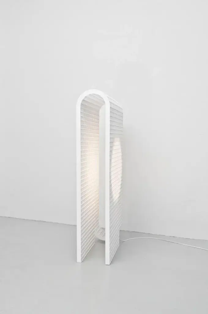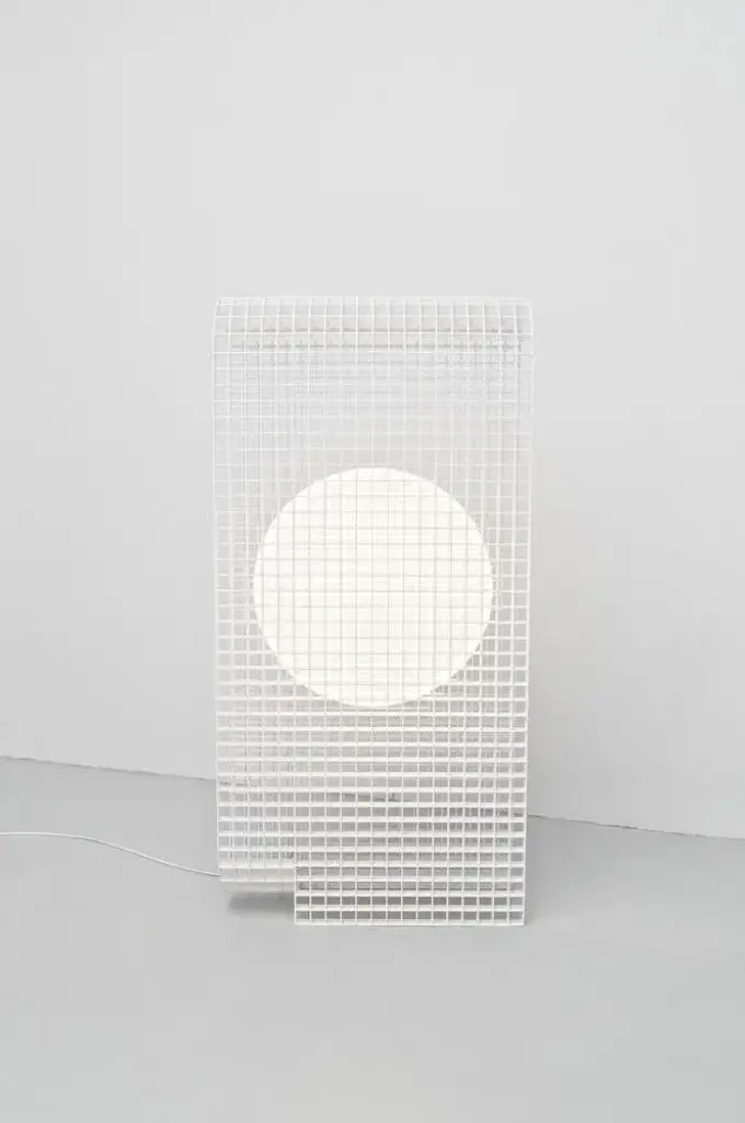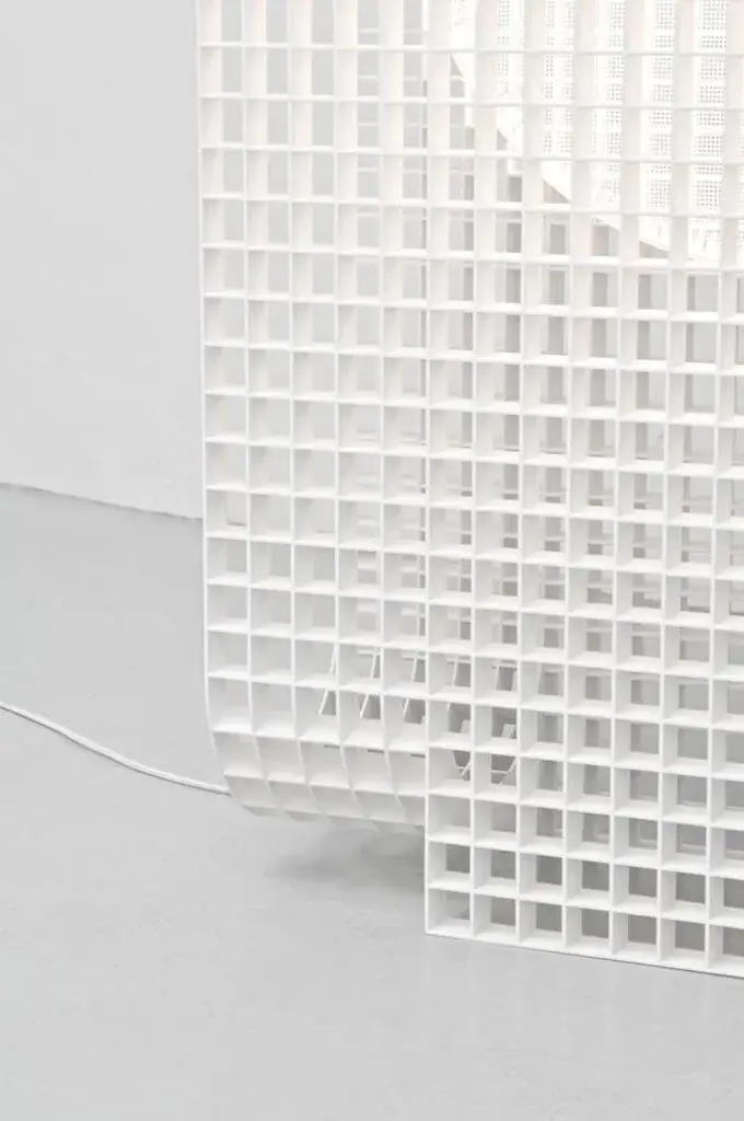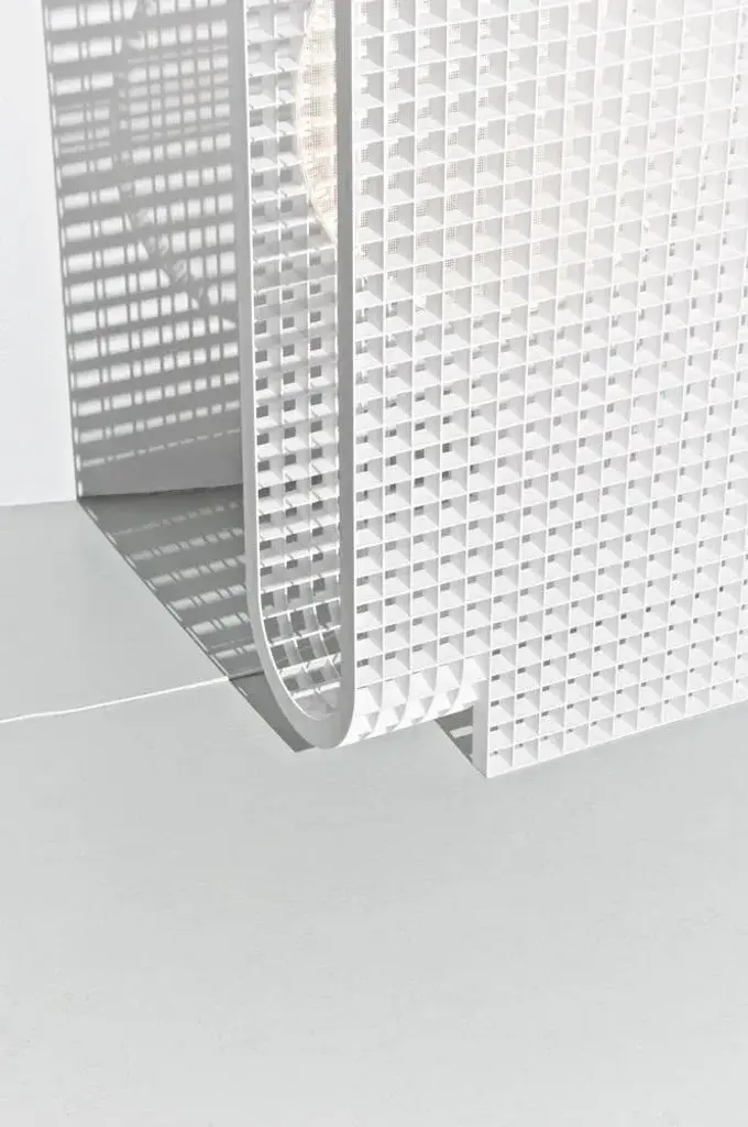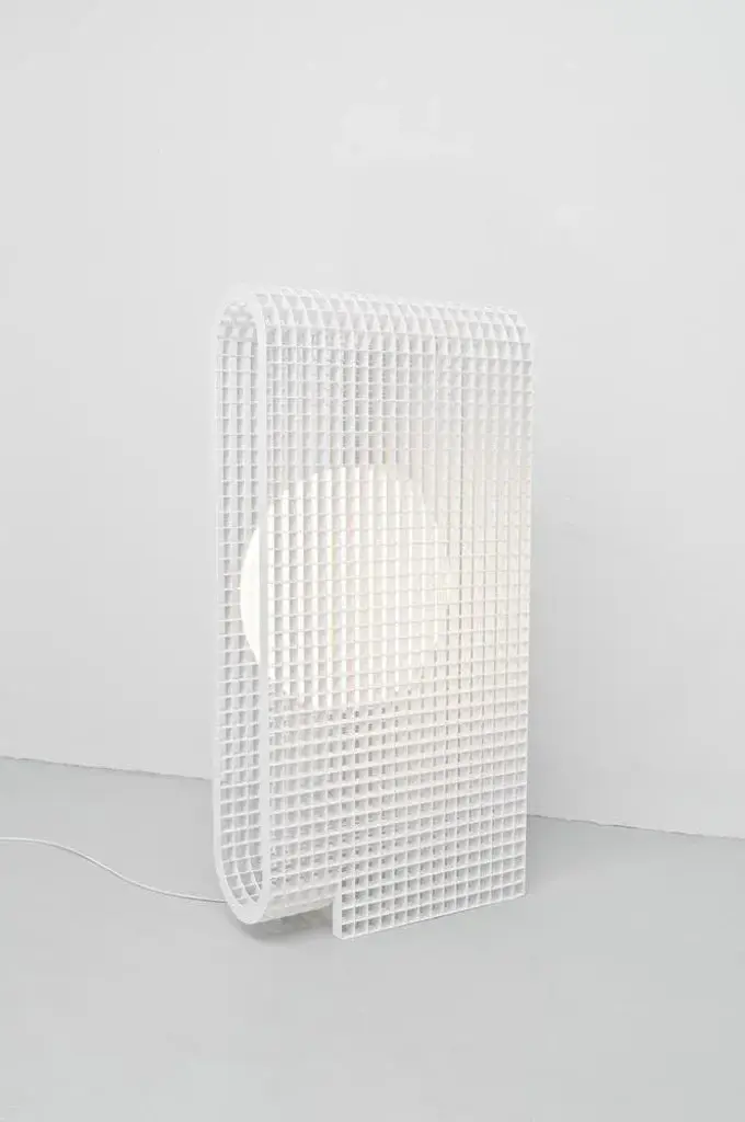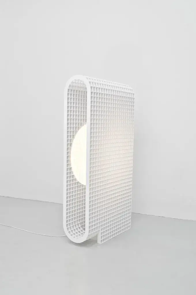 Matrix lamp by os and oos dimensions: 60.2 x 24 x 123 cm materials: powder coated steel the matrix project is and began as a system to allow for endless configurations and constructions. The base concept is derived from architectural constructions and solutions for multipurpose form meets function situations. As the construction of the matrix is built up of individual ribs, the ribs can be designed any which way. This allows the system to be applied to products as well as interior features, or even architectural structures themselves. When view from the front the grid structure has a very transparent character but as the structures start to bend the transparency disappears in a gradient of light type fashion. The inner surfaces of each individual square capture and play with light and appear differently from all other perspectives. this piece is attributed to the mentioned designer/maker. It has no attribution mark and no official proof of authenticity, however it is well documented in design history. I take full responsibility for any authenticity issues arising from misattribution, up to 250v (europe/uk standard).