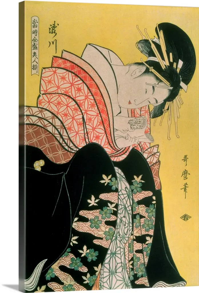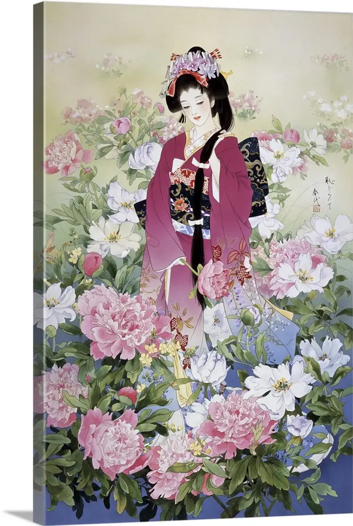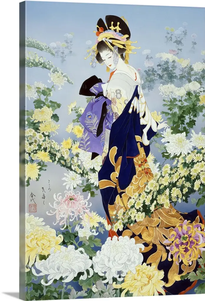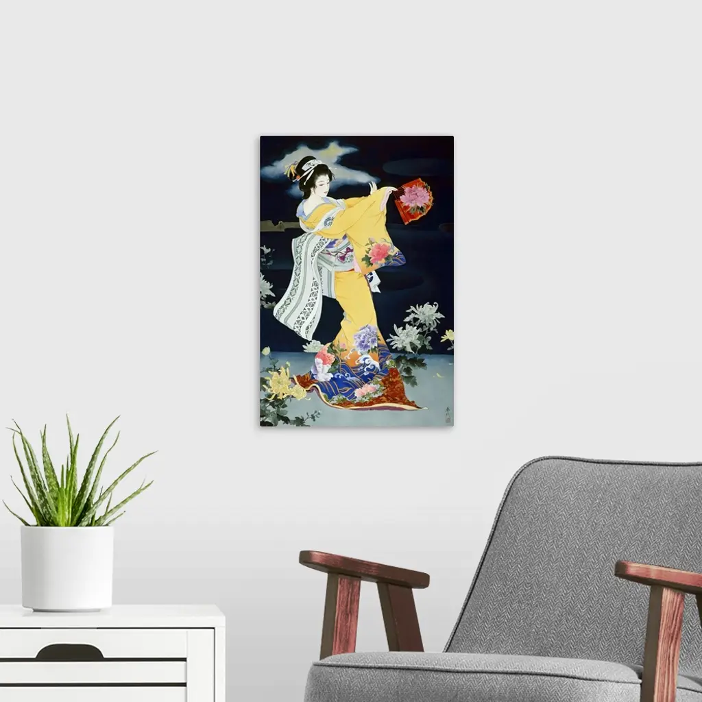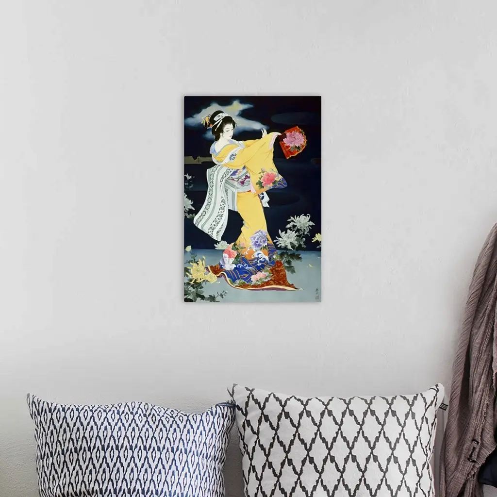 Contemporary colorful Asian art of a Geisha in beautiful ornate clothing.