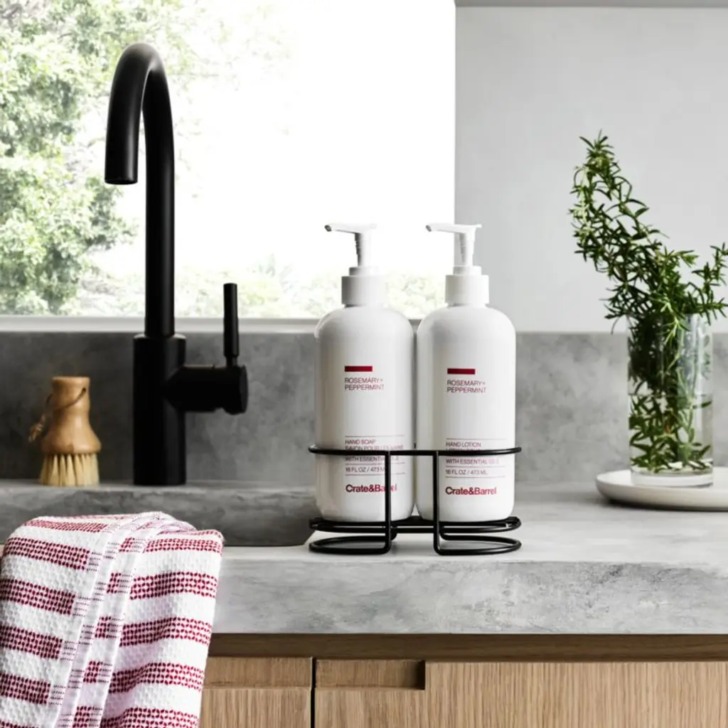 Corral bottles of dish soap and countertop spray or hand soap and hand lotion with this matte black caddy. Designed to pair with our exclusive kitchen scent collection (sold separately), the carbon steel holder keeps two of our 16-oz. bottles right where you need themand brings a neat and modern look to your countertop.